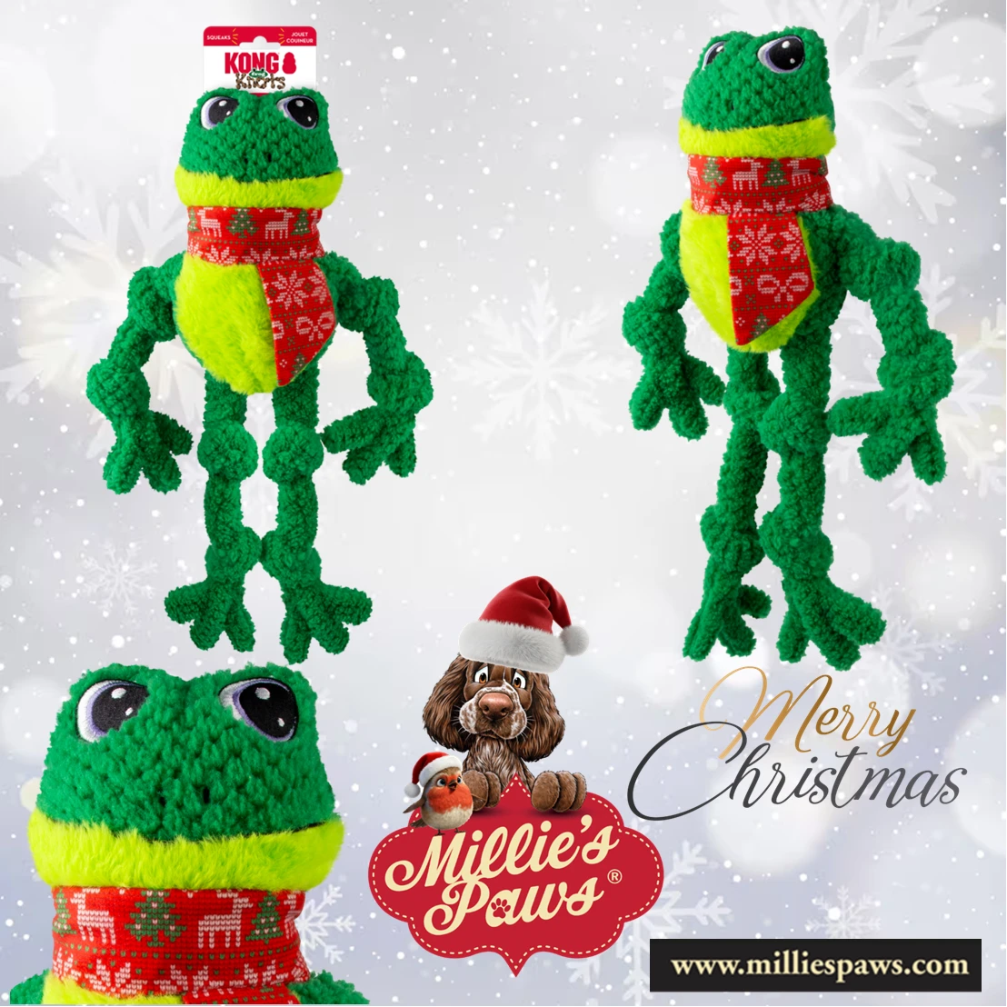 KONG Holiday Knots Frog’s oversized, floppy body invites tugging, thrashing, and gnawing to playtime, while its soft dual plush material is perfect for carrying and snuggling. The inner rope skeleton provides durability, and a squeaker in the head entices extended play sessions. Festive outfit makes this amphibian the perfect gift this holiday season.