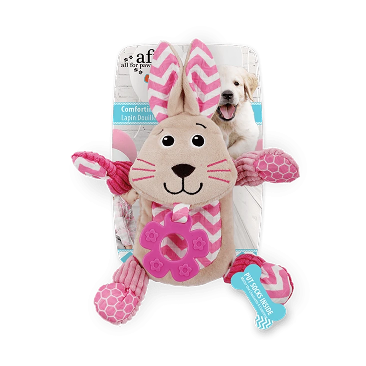 Comforting Bunny is made with multiple textures to provide exciting tactile stimulation   the perfect way to keep them entertained. Plus, it comes with a clever little pocket specifically designed for a fabric that carries your scent. Not only will this help give your pup some extra comfort while you’re away, but it'll also be great for bonding times when you’re together.