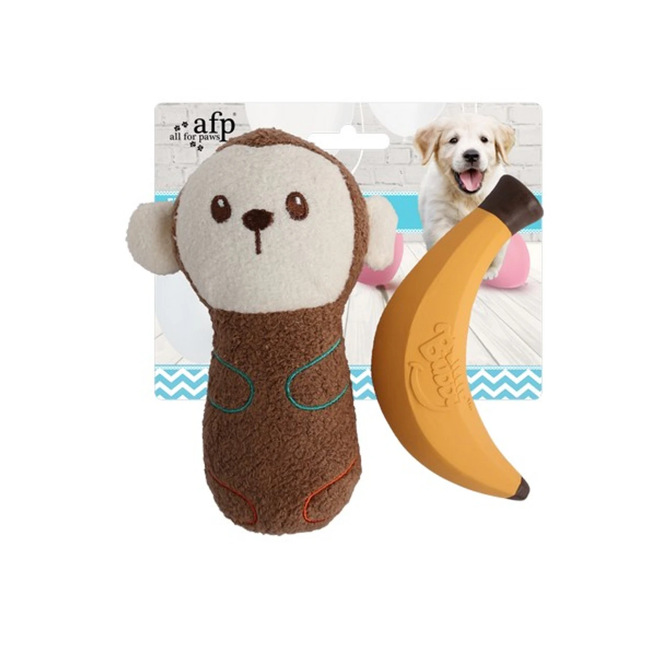 All For Paws Little Buddy Happy Monkey 2 pack Toy features two adorable and fun toys that will bring joy to both you and your dog. The set includes a soft plush monkey toy and a durable latex banana toy, offering a variety of textures for different types of play. Designed for small dogs, the compact size makes it easy for them to carry and enjoy. These friendly, cute designs add excitement and charm to your dog’s toy collection.