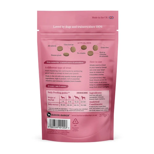 Baker and Baker Cranberry and Liver treats have all the goodness and meaty taste of their foundation liver treat range with added cranberry extract. A recognised 'superfruit', cranberries are rich in vitamins including A, B1, B2, C, and many nutrients. They are also packed full of minerals and antioxidants. Cranberries are an excellent supplement to your dog’s diet for the promotion of urinary tract and bladder health. The unique flavenoids found in cranberries (called proanthocyanidins or PACs) can also reverse and inhibit the bacteria responsible for dental plaque.