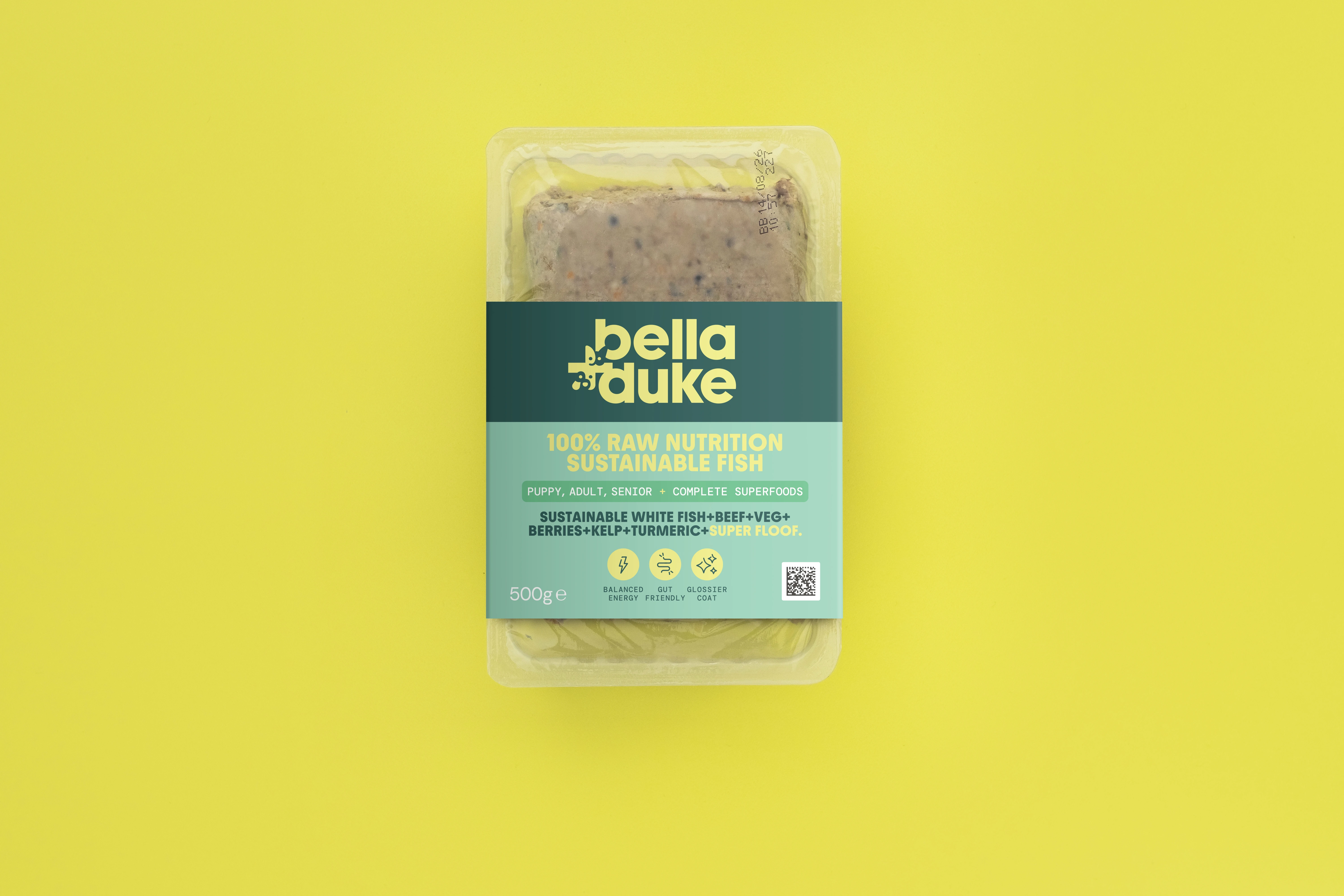 Bella and Duke Super Fish with Beef Complete Superfoods Super Floof 500g helps clear out your shampoo and conditioner stash. What pooch’s need for oh-so super soft fur is omega 3 rich fish mixed with a splash of pure olive oil. With its delicious blend of 80% white fish and beef combined with an extra dose of superfood goodness, this complete, raw meal supports your pet’s health to help them thrive. Designed to aid heart health and brain function, as well as joint support and better digestion, this tasty meal is set to become a firm favourite for your furry friend. A diet that’s made up of high quality protein is essential for your dog. It ensures they have enough energy and provides them with the essential amino acids they need and can’t produce naturally to stay fit and healthy. Amino acids are the building blocks of life. They’re vital for making sure the body functions properly. Whether it’s boosting their immune system, building and repairing muscle and cartilage, or producing and balancing hormones, meals with plenty of protein are a must. With a blend of meat and fish, this raw meal also adds variety to their menu, which not only benefits their health, but means they get excited for meal time too.