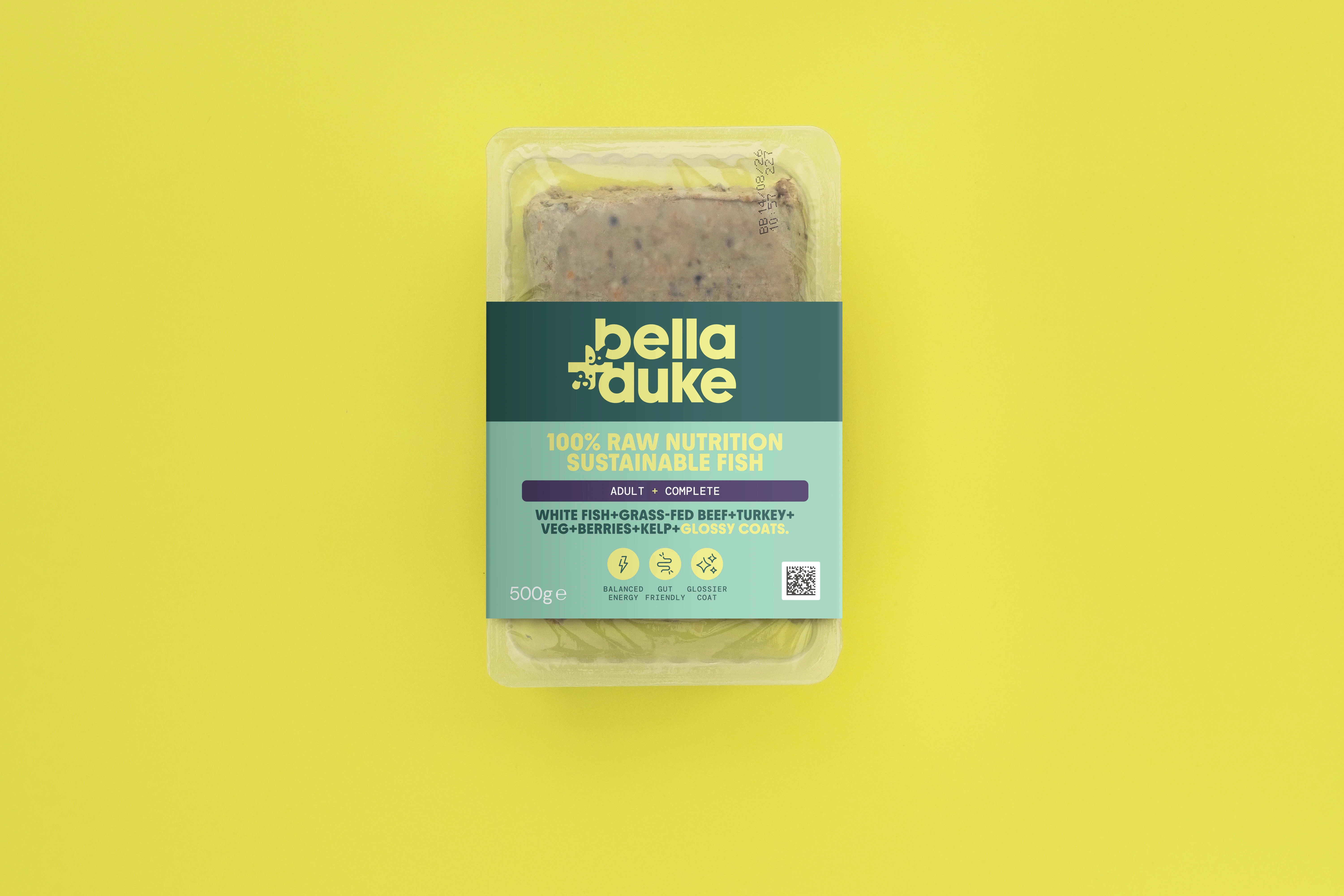 Bella and Duke Sustainable Fish Adult Complete Raw cancel the groomer because omega rich sustainable fish with a splash of pure olive oil gives pooches' coats a shine no conditioner can.