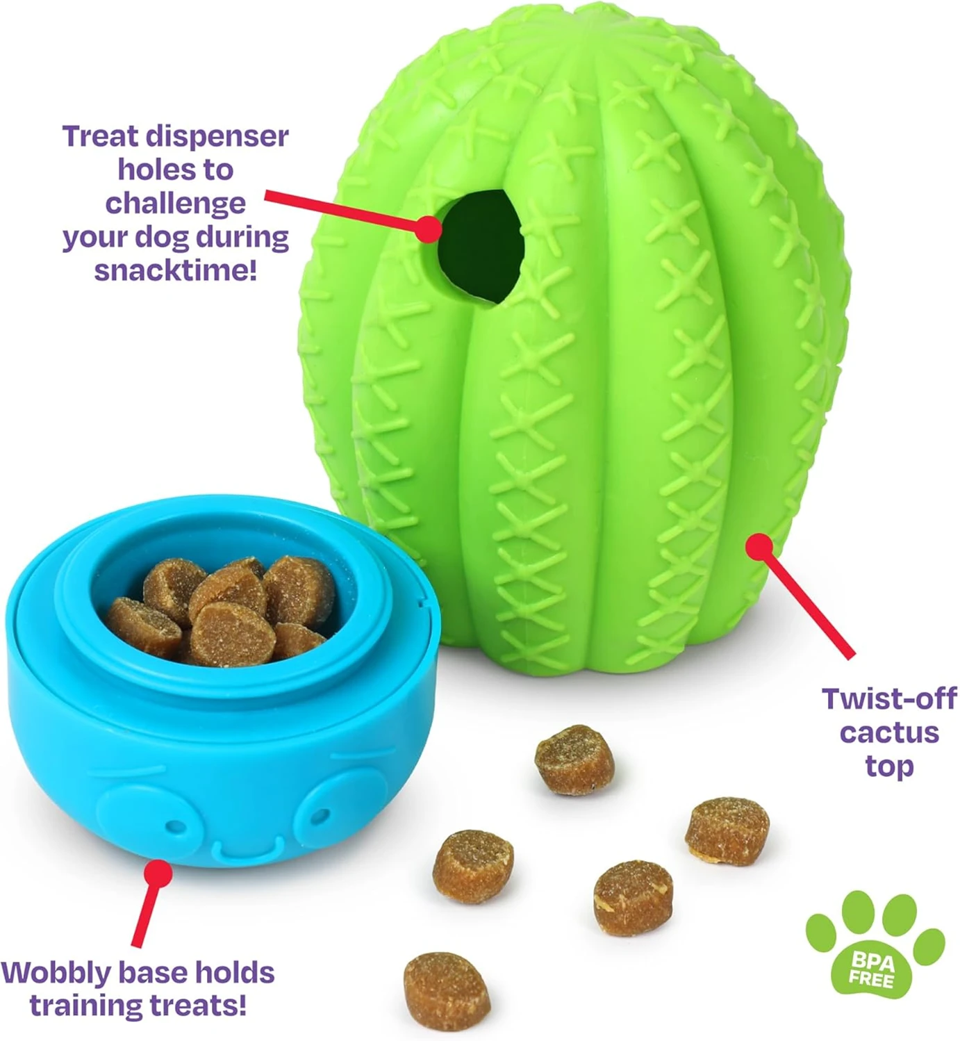 Brightkins Cactus Surprise Treat Dispenser, dogs use their brains and paws to free the treats from inside this wiggly, wobbly cactus! It’s easy to use, simply fill with treats or kibble and encourage your dog to use its nose and paws to free the treats inside as the cactus rolls, wobbles, and wiggles. The slow release of food encourages fast feeders to slow down.