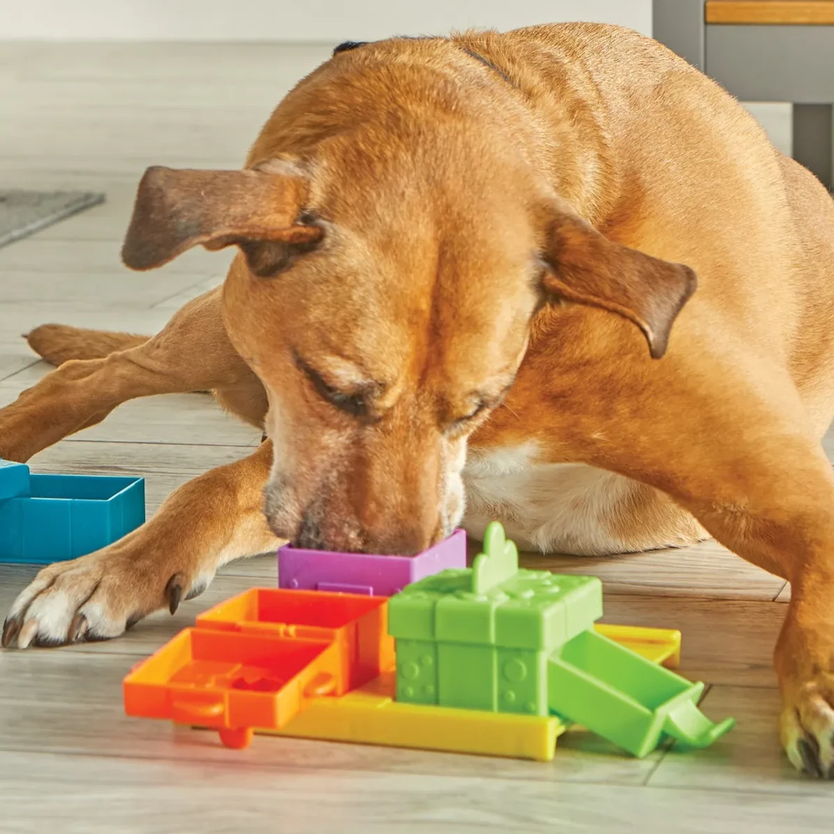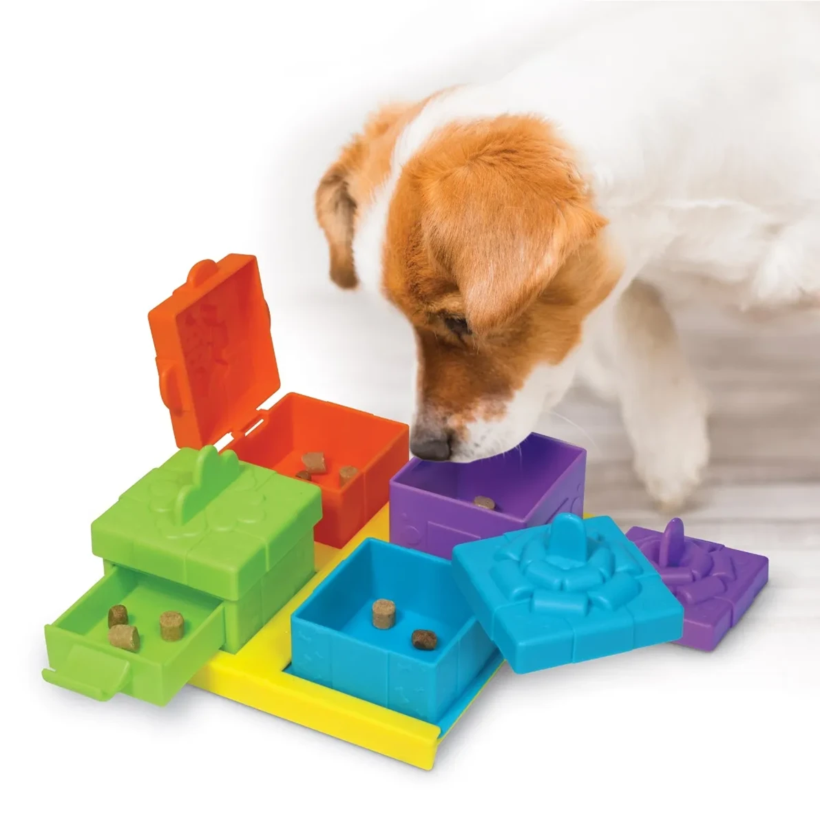 Place treats or kibble inside each present, and cover with the present lids. Then encourage your dog to find the treats hidden inside. Each present opens in a different way to keep dogs engaged and learning.