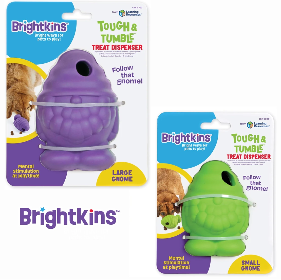 Brightkins Tough and Tumble Treat Dispenser Gnome, add some bouncing, bopping, tough and tumble fun to snack time with the Small Gnome Tough and Tumble Treat Dispenser from Brightkins. Designed for use with both treats and kibble, this easy to fill pet treat dispenser is an interactive dog toy that brings mental stimulation to mealtime. As they bat around the bouncing, rubber tough gnome to release the food inside, dogs will use their brains to solve this treat dispensing dog toy's puzzling challenge and keep their brains boredom free.