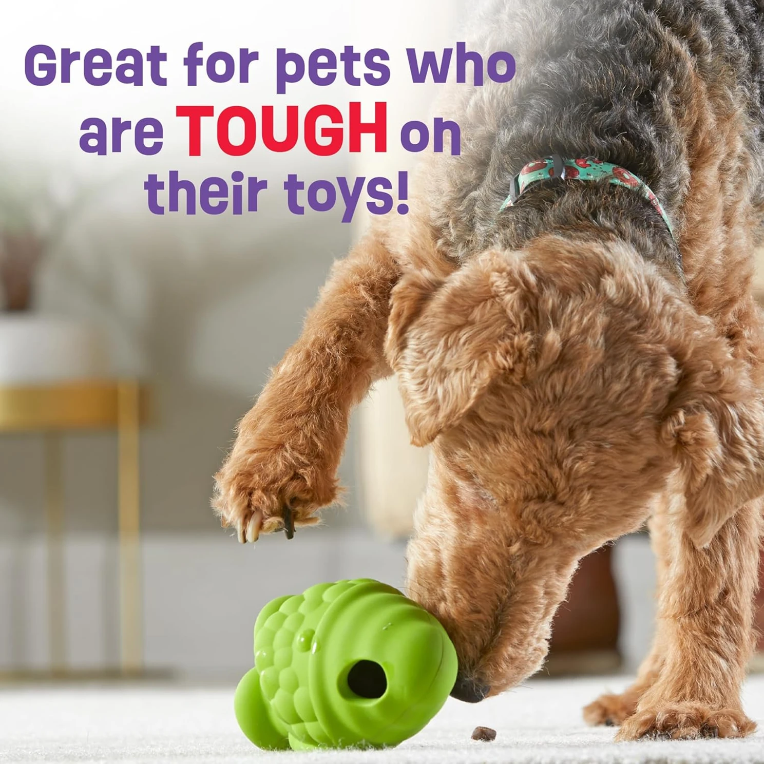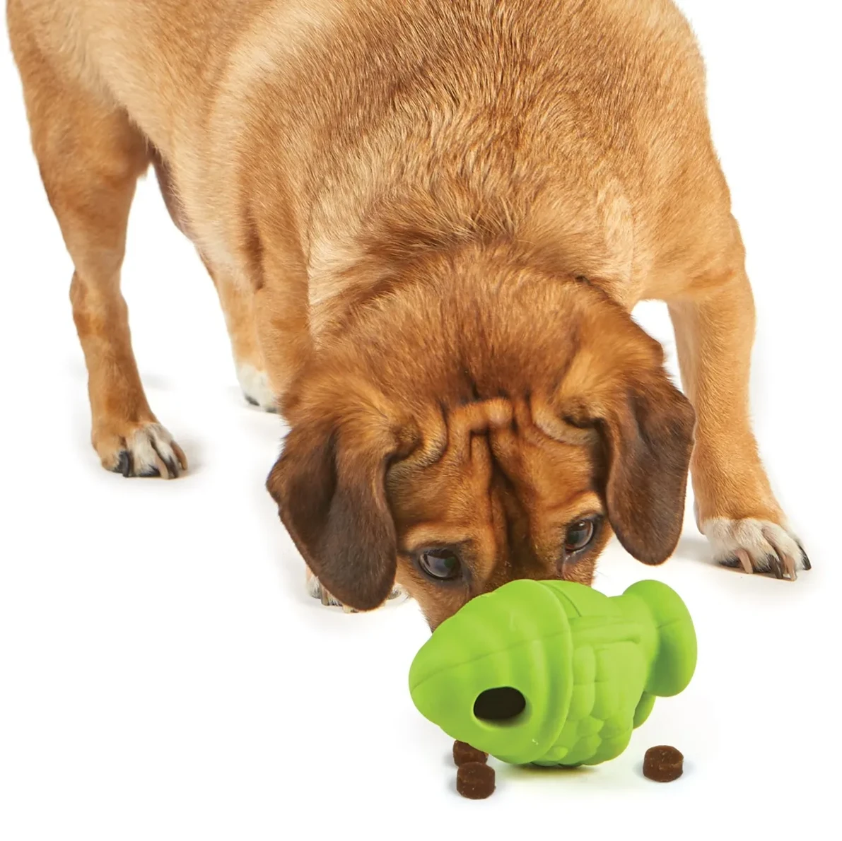 Load this bouncing rubber tough dog treat dispenser with treats or kibble, then watch dogs use their brains (and paws) to free the tasty snacks inside and play their own dog games.
