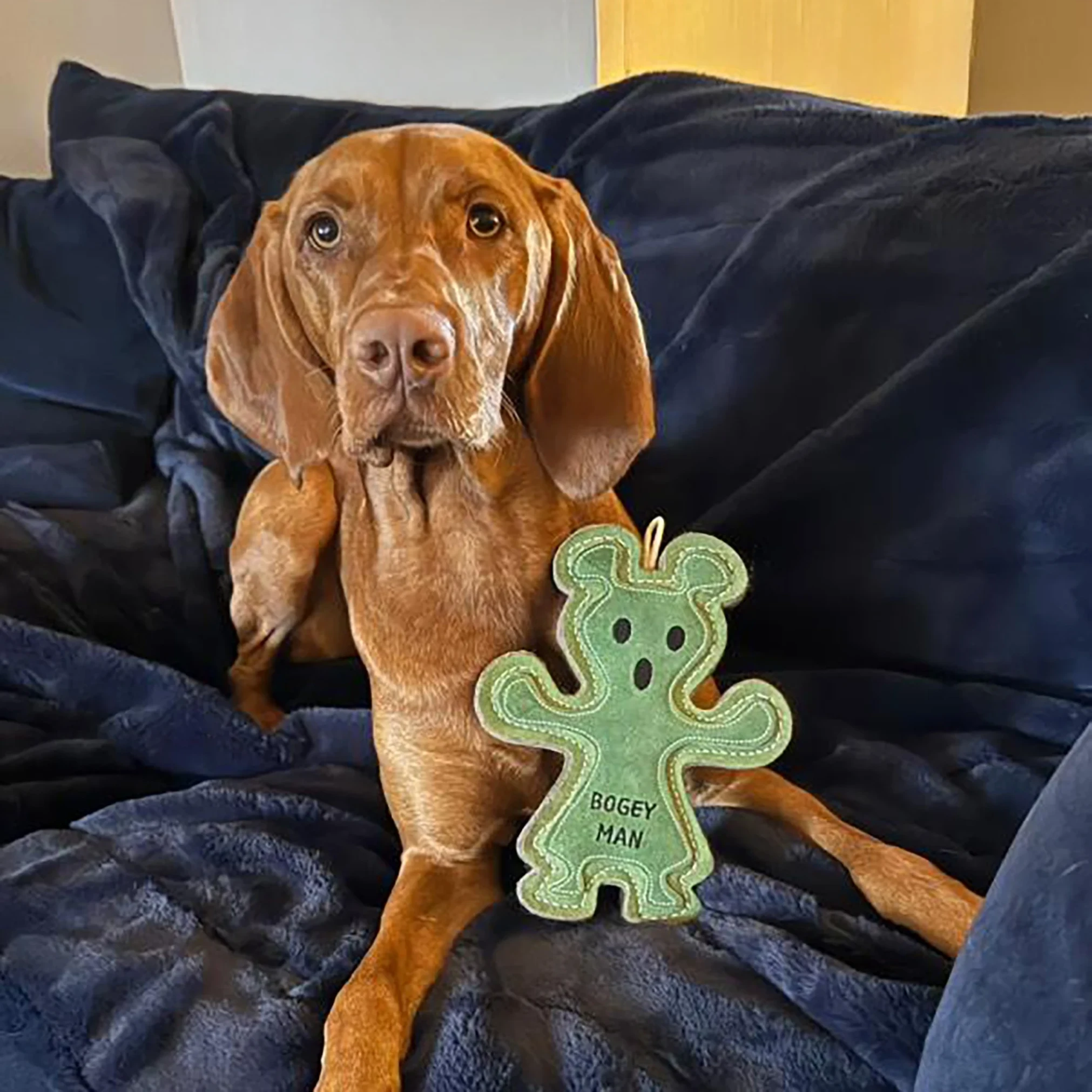 Green and Wild’s Bogeyman Eco Dog Toy spooky and sustainable fun for dogs of all ages! Super-natural in all senses, Bogeyman is made from layers of compressed felt stitched over with soft suede. The suede is a byproduct, ensuring that this material is not wasted, and wool felt is biodegradable.