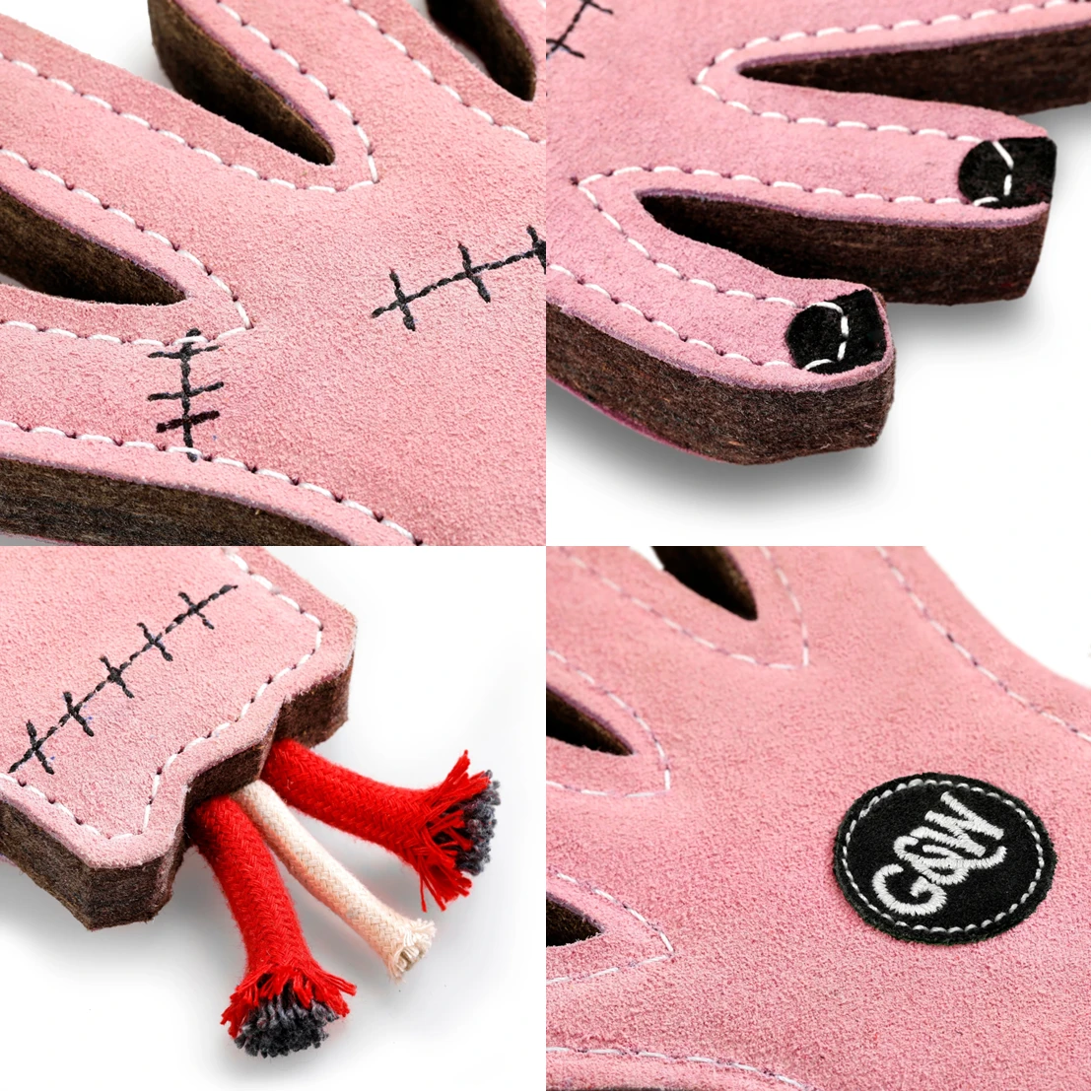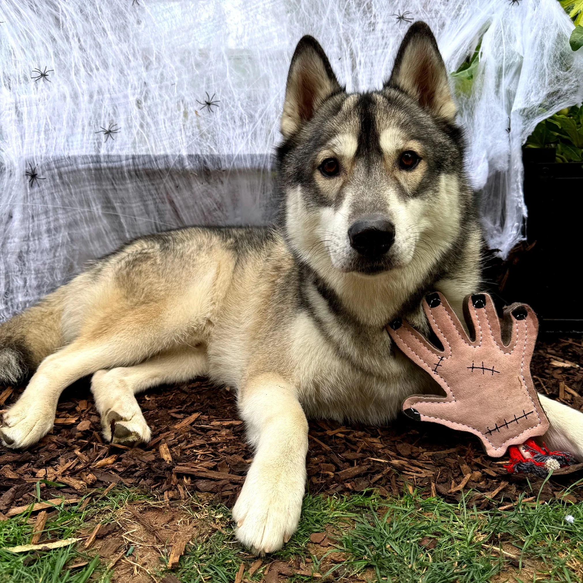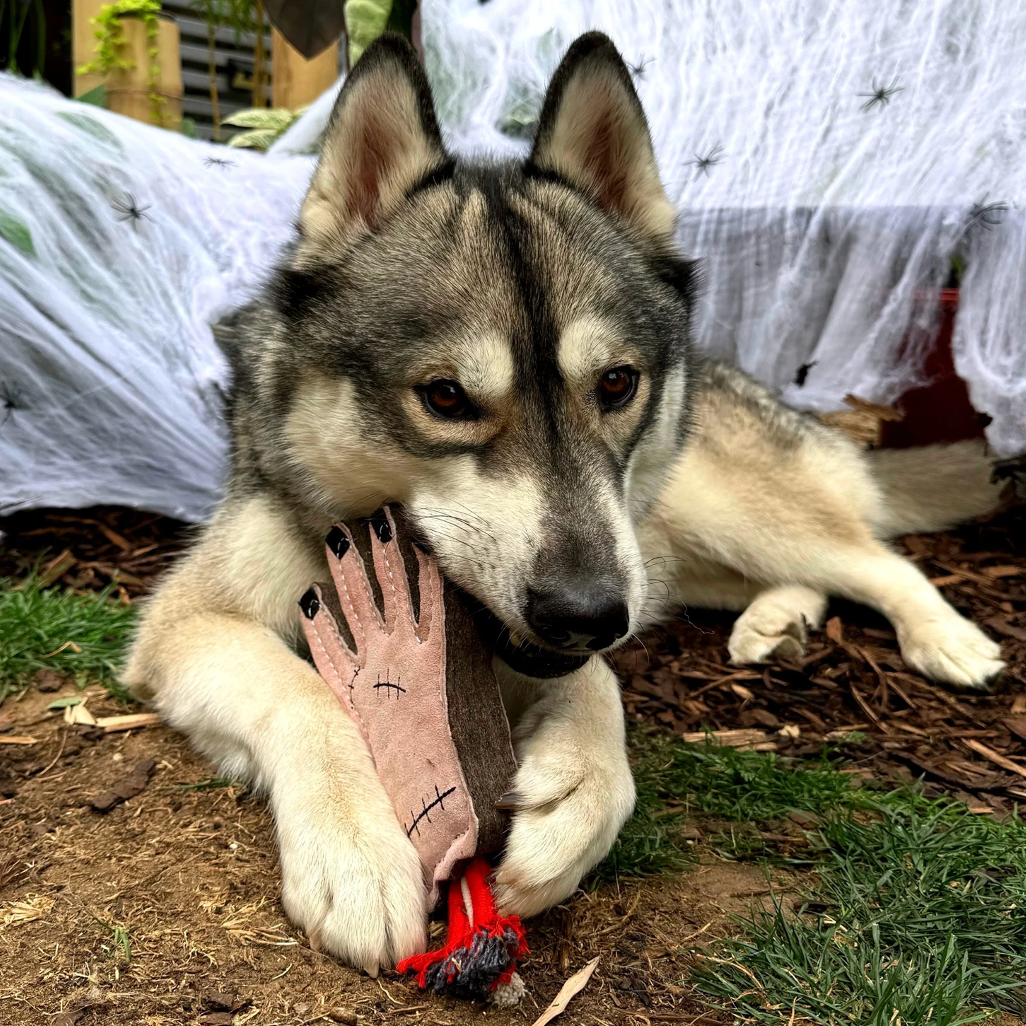 Green and Wild’s The Hand Eco Dog Toy spooky and sustainable fun for dogs of all ages! The Hand is made from layers of compressed felt stitched over with soft suede and natural jute rope. The suede is a byproduct, ensuring that this material is not wasted, and jute is a plant material that's sustainable and biodegradable. Wool felt is biodegradable too.