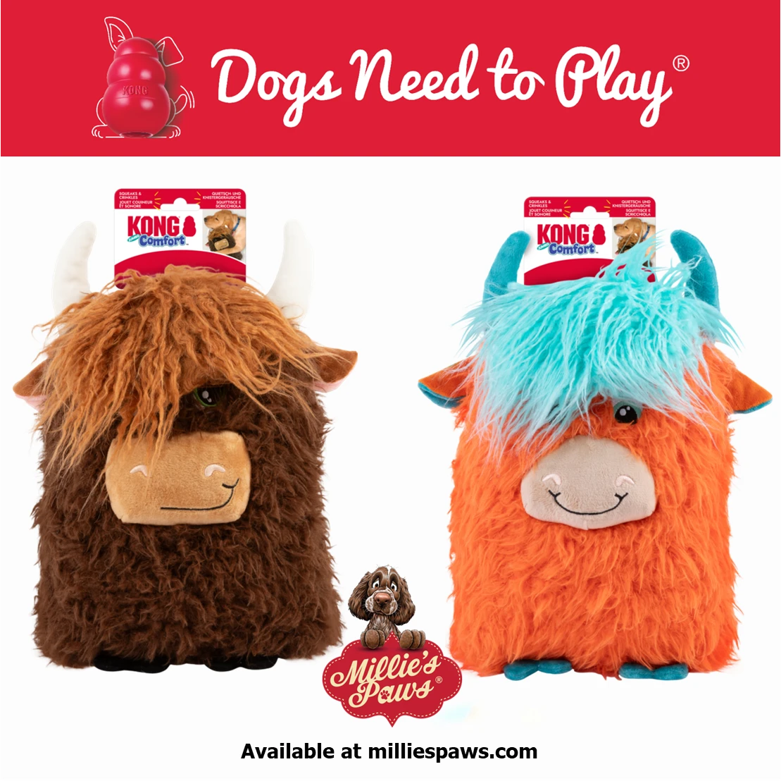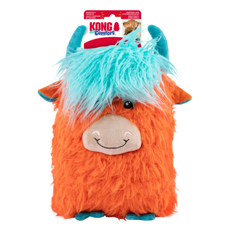 KONG Comfort Jumbo Highland Cow gives cool cow vibes with a plush body, shaggy fur, floppy hair, squeakers, and crinkle material, keeping dogs of all sizes engaged in multisensory fun. Perfect for cuddling when the party’s over. Ideal for indoor play.