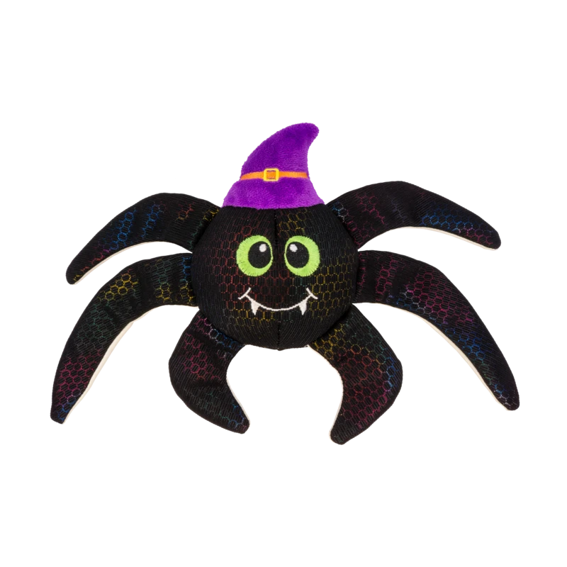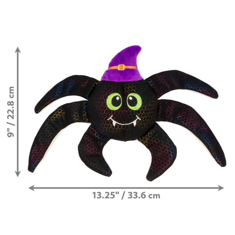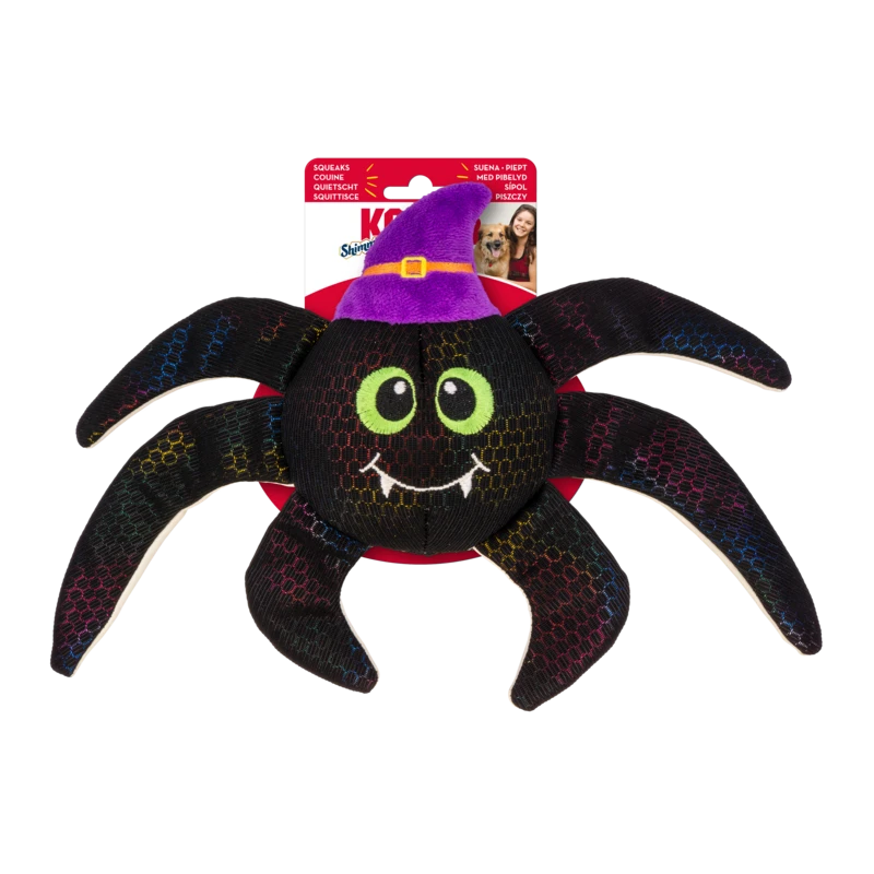 KONG Shakers™ Shimmy Spiders combine shiny shimmery outer material with an inner crackle and squeaker for multisensory play. Spooky-sweet features and a plush mouthfeel make this arachnid the perfect snuggle buddy on dark nights.
