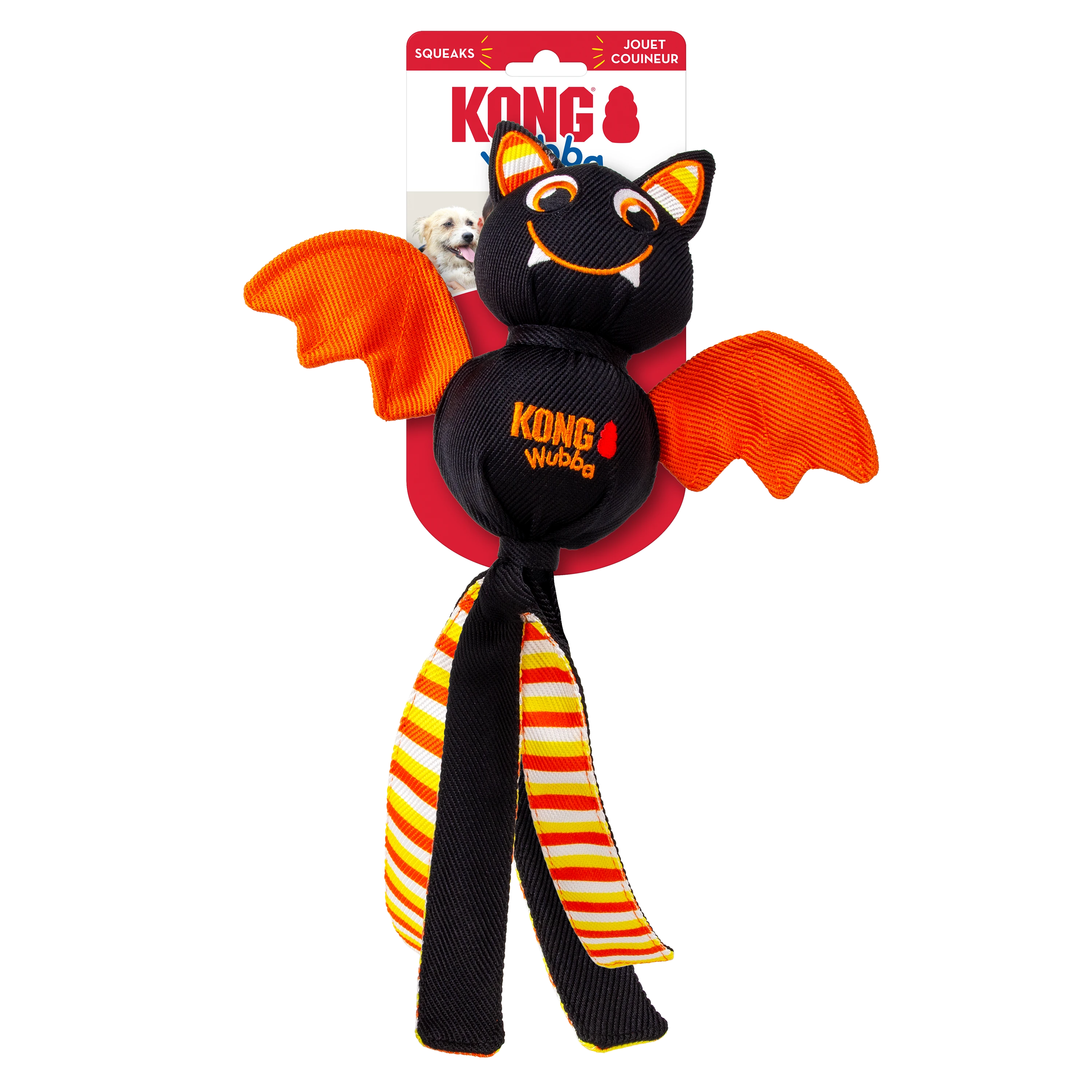 KONG Halloween Wubba Ballistic Bat brings nocturnal fun tug and fetch playtime! With durable KONG Ballistic material, flappy wings for shaking, long tails for thrashing and tugging, and a squeaker to extend play.