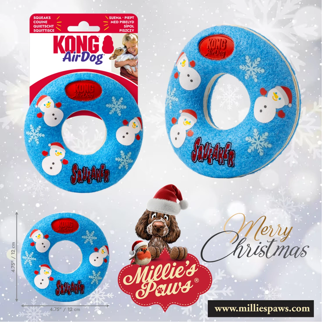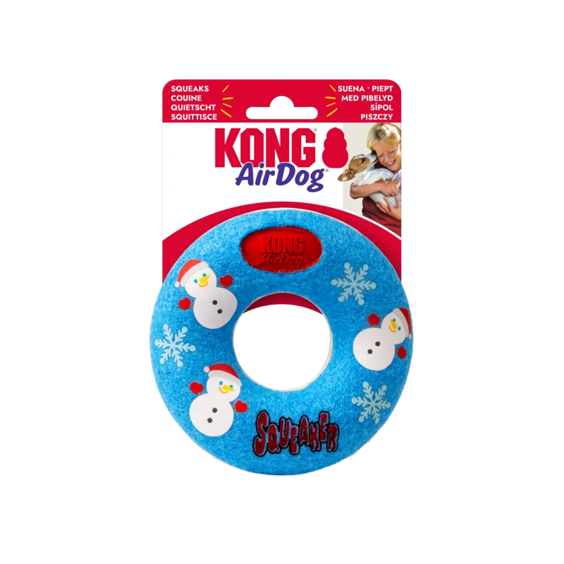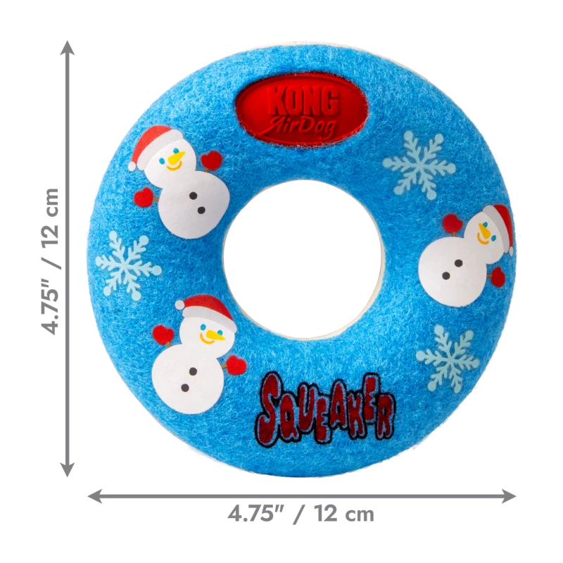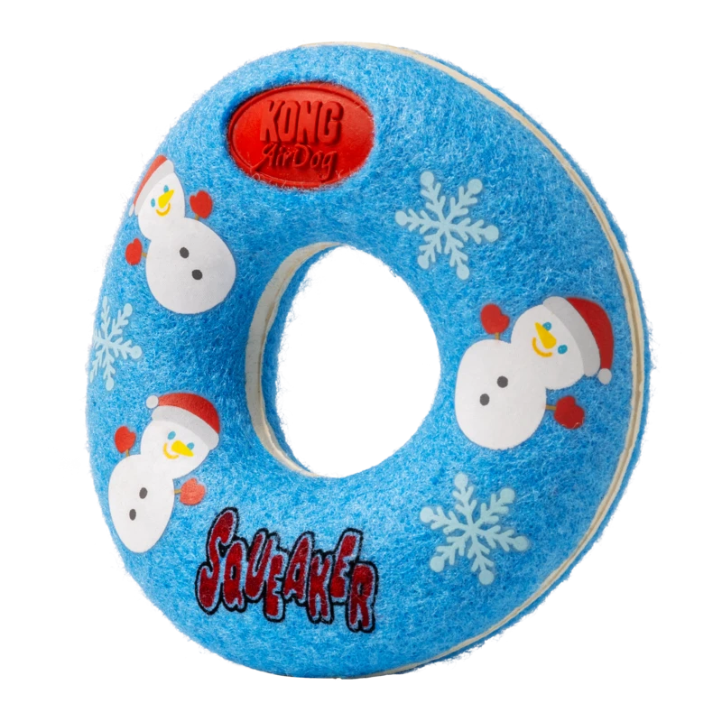 KONG Holiday AirDog Donut combines two favourites, a tennis ball and a squeaker into one fabulous fetch toy to help pups ring in the holidays with tons of fetching fun. KONG Tennis nonabrasive material is softer on teeth than regular tennis ball felt. The squeaker calls dogs to play while the dynamic bounce makes for unpredictable rebounds, rolling and fetching fun with a dog friendly holiday donut with a hole that makes grabbing easy.