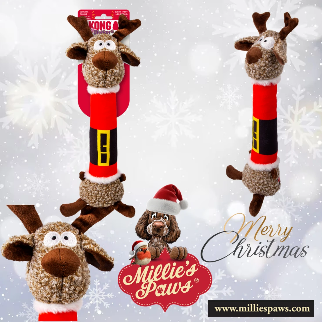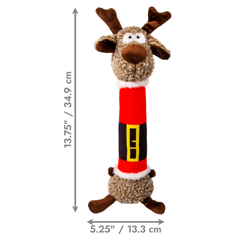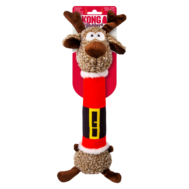 KONG Holiday Shakers Luvz Reindeer’s long, floppy body satisfies dogs’ shaking instincts and is also ideal for sliding down chimneys. Low tone squeaker keeps dogs playing through the holidays and beyond, providing tons of healthy, active play with a pal dressed up for the holidays.