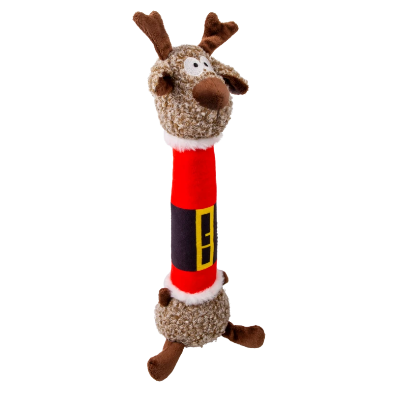 This long, skinny reindeer’s the ideal shape for thrashing fun and sliding down chimneys! Low tone squeaker prolongs play, holiday sweater brightens the fun.