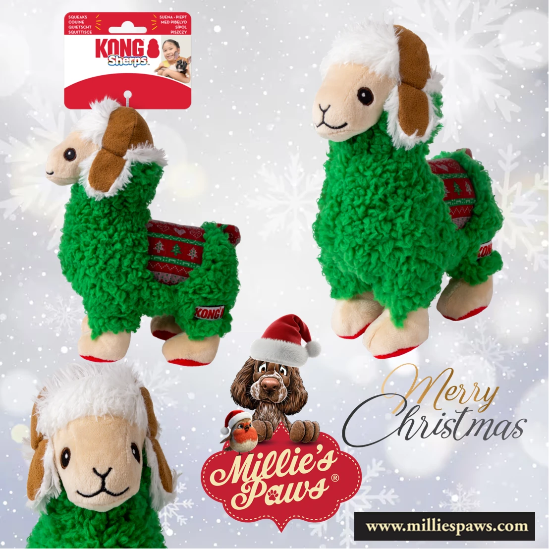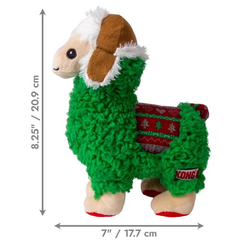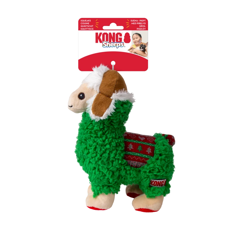 KONG® Holiday Sherps Llama is full of cheer and the perfect plush toy for the holidays. Soft, squeaky, and crinkly, it makes the perfect play pal or snuggle buddy. Seasonal print makes this adventure buddy ready for any indoor wintertime excursion!