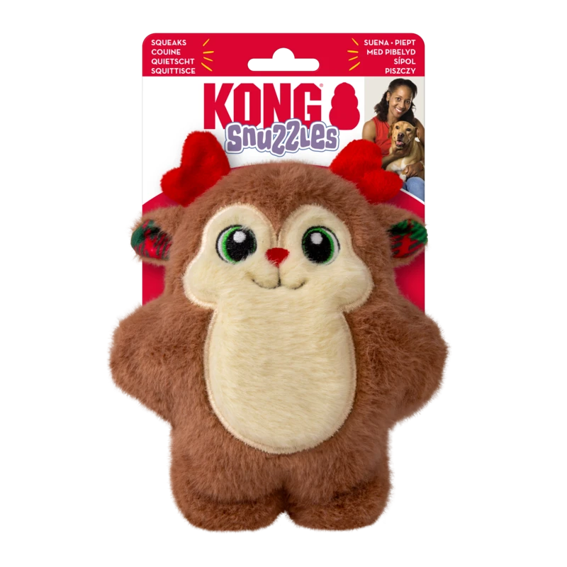 KONG Holiday Snuzzles Reindeer is plump full of fun! Filled with a full body squeaker that gives a long, loud call and a super plush exterior that is perfect for holiday snuggles. The dense mouthfeel extends engagement by rewarding appropriate chewing with every bite. Ideal for indoor fun when the weather outside is frightful, the flat shape is ideal for dogs of all different sizes.