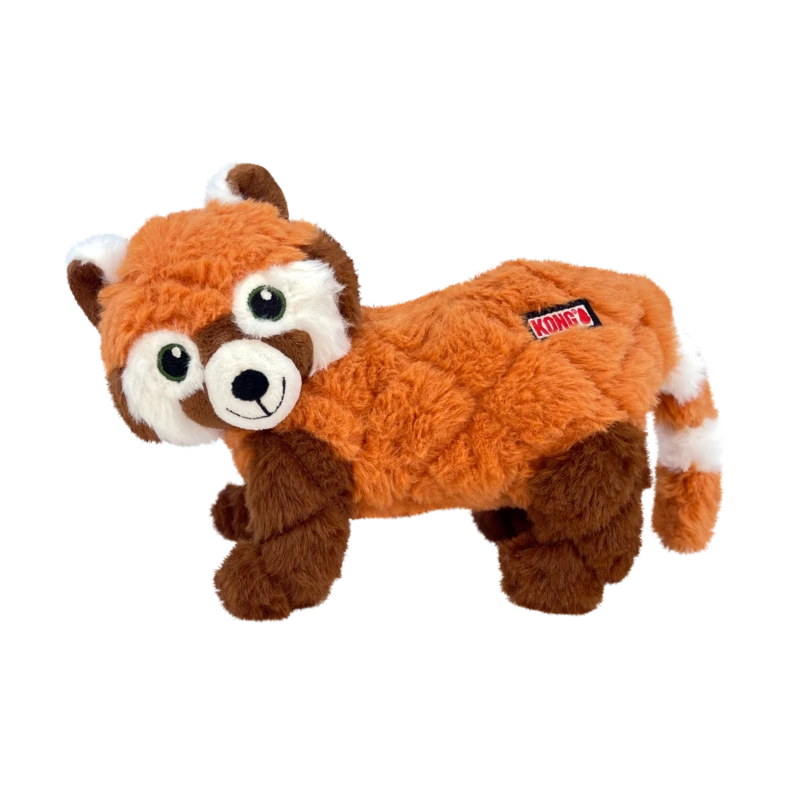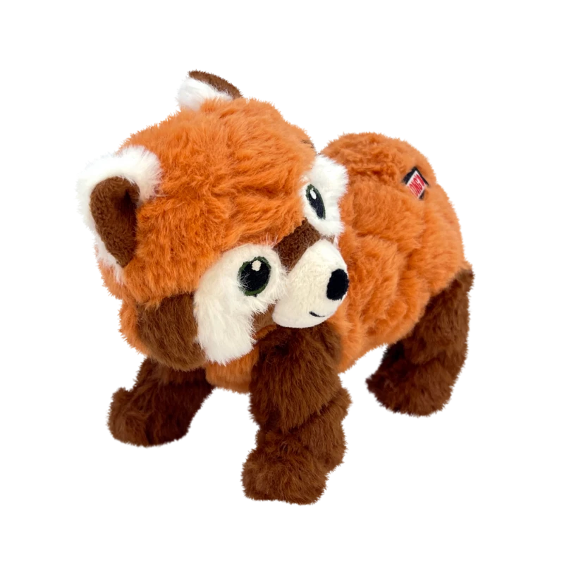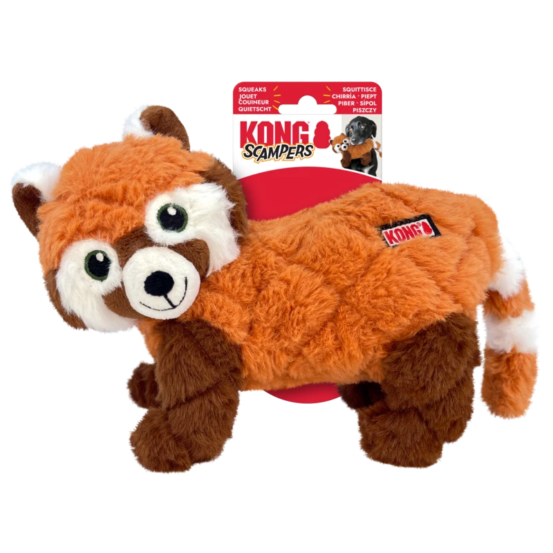 KONG Scampers Red Panda offers an expedition of fun wildlife characters, whisking your pet away to far off continents no passport needed! These uniquely poised plush characters with tilted heads and curved tails make each animal come to life in its soft, quilted body. The low tone squeaker entices curiosity, play, nuzzling, gumming, and snuggling.