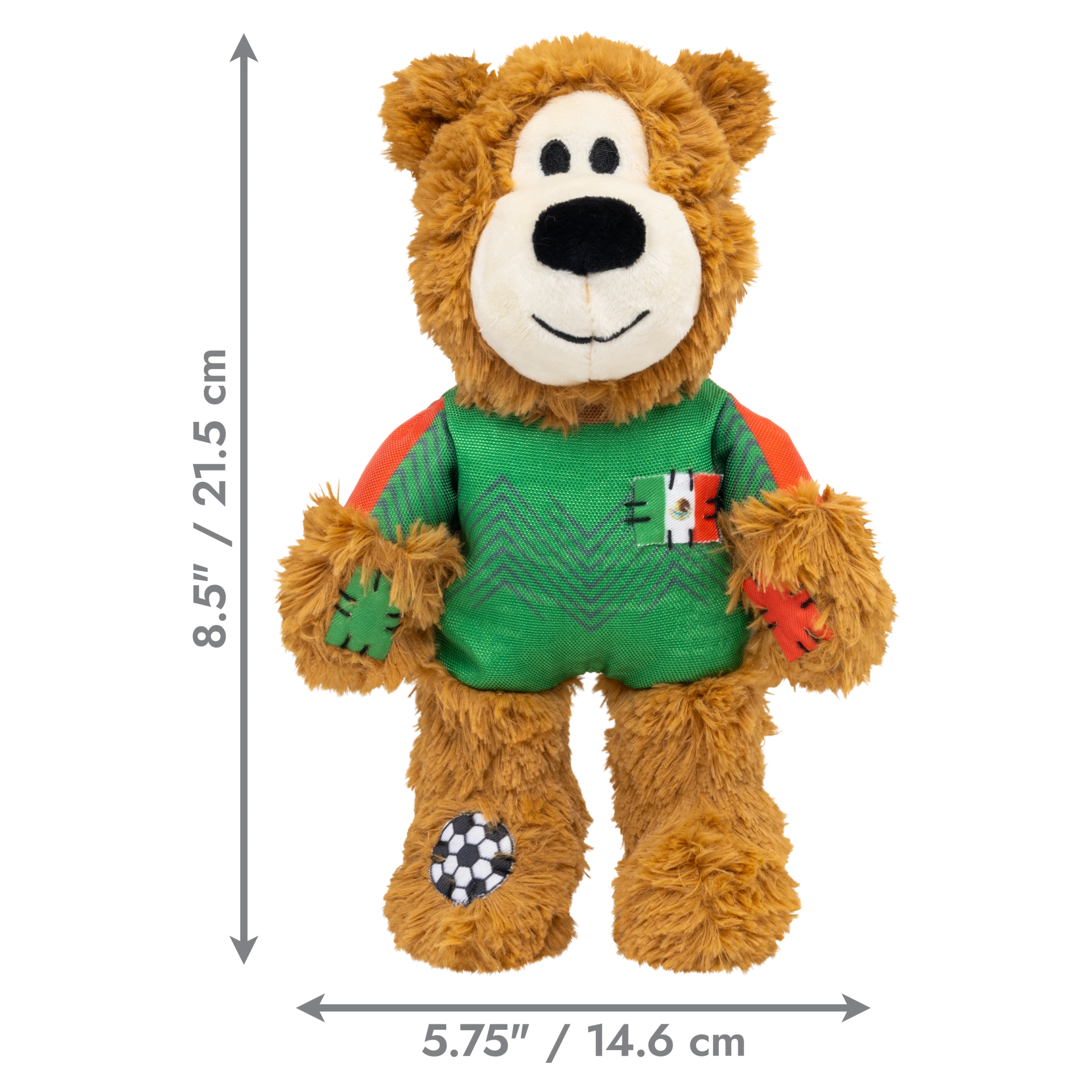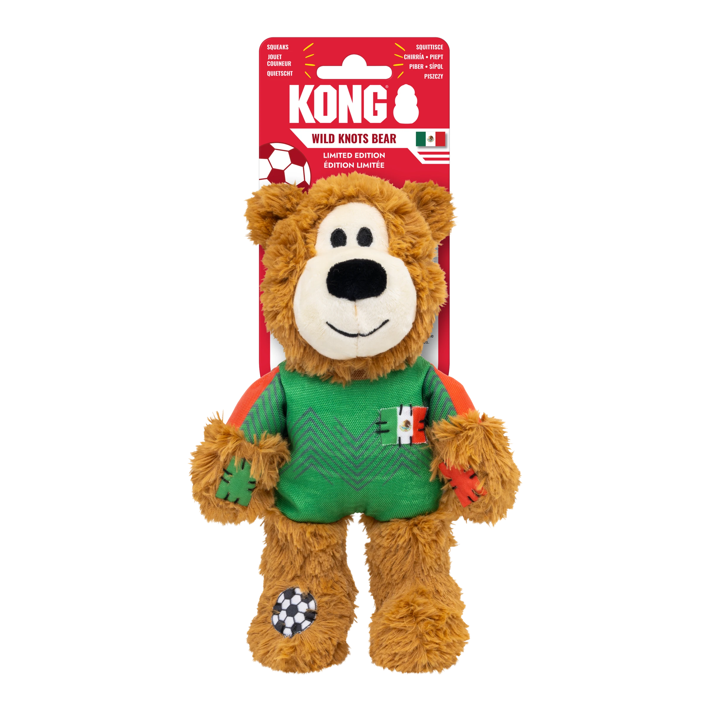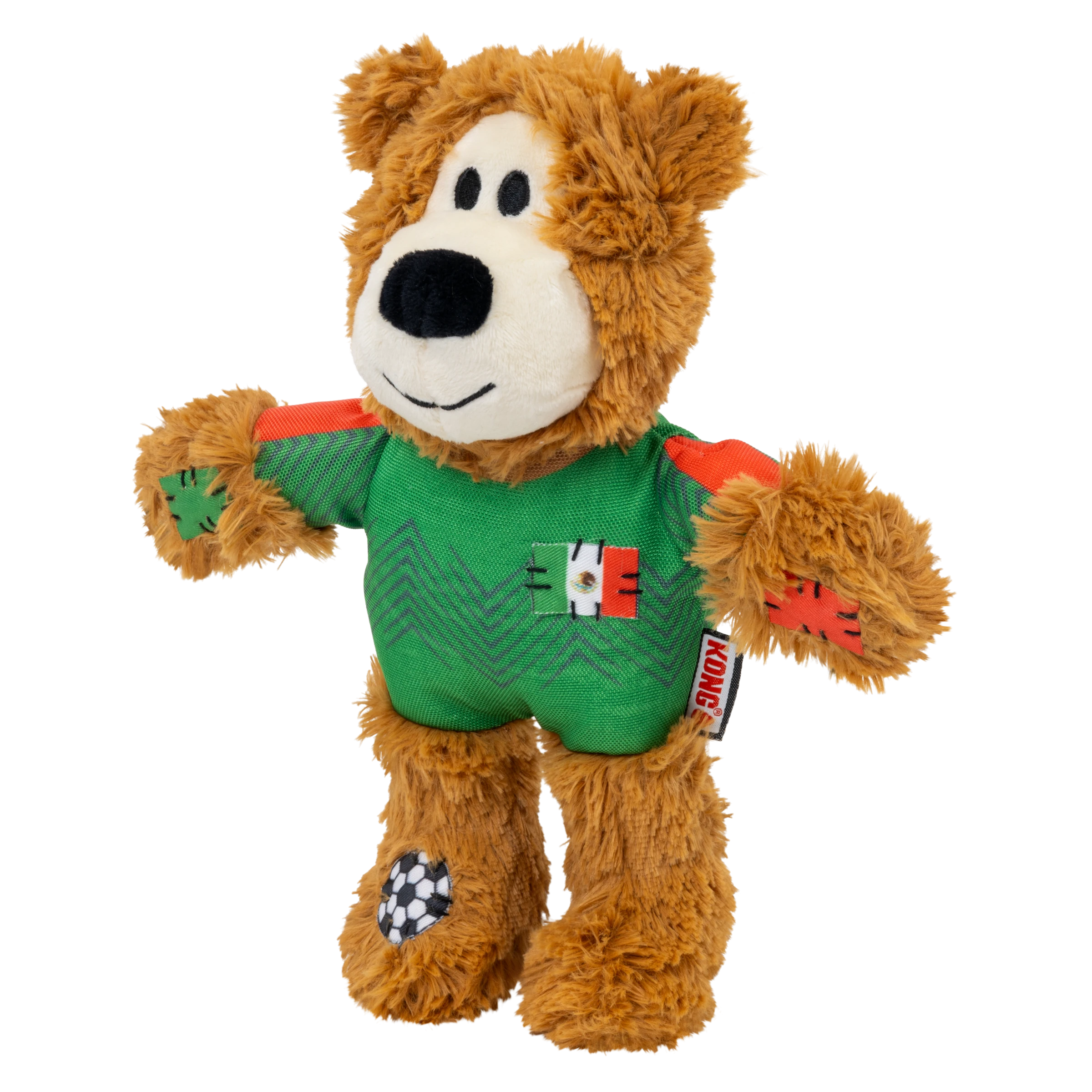 KONG Wild Knots Sport Bear is proud to represent its home country in its Limited Edition uniform. Aiming to take the dog park by storm in its playtime debut, Wild Knots Bear plays with six knots and a soft yet durable texture. Thanks to hours of training and its internal knotted rope, this toy withstands playful pulling and light chewing while catering to dogs' playful instincts to thrash, tug, and wrestle. Varied textures and a squeaker keep the fun going, but this plush pal is the perfect snuggle buddy when it's time for a post play recovery nap. Whether you're cheering for their team or allowing your dog to gnaw on the competition, Wild Knots Bear is the perfect teammate when it's time to play.