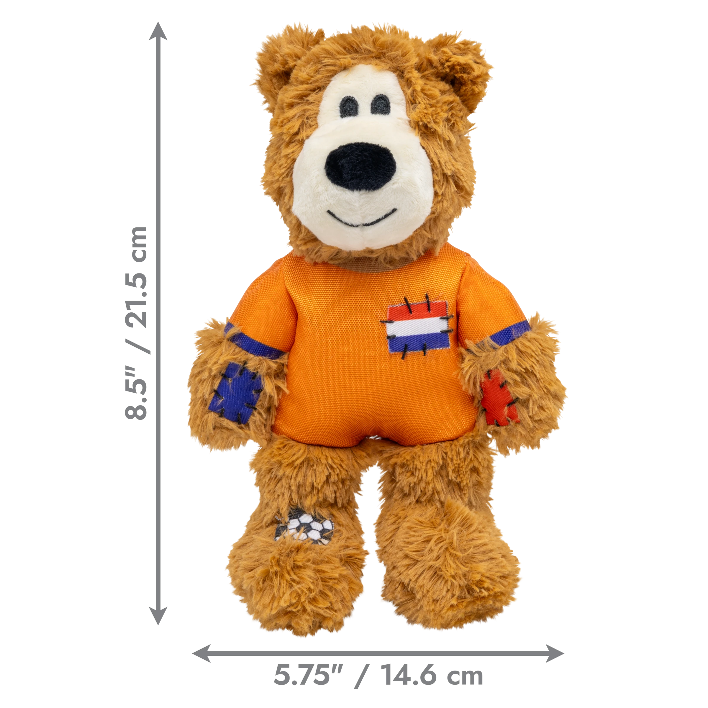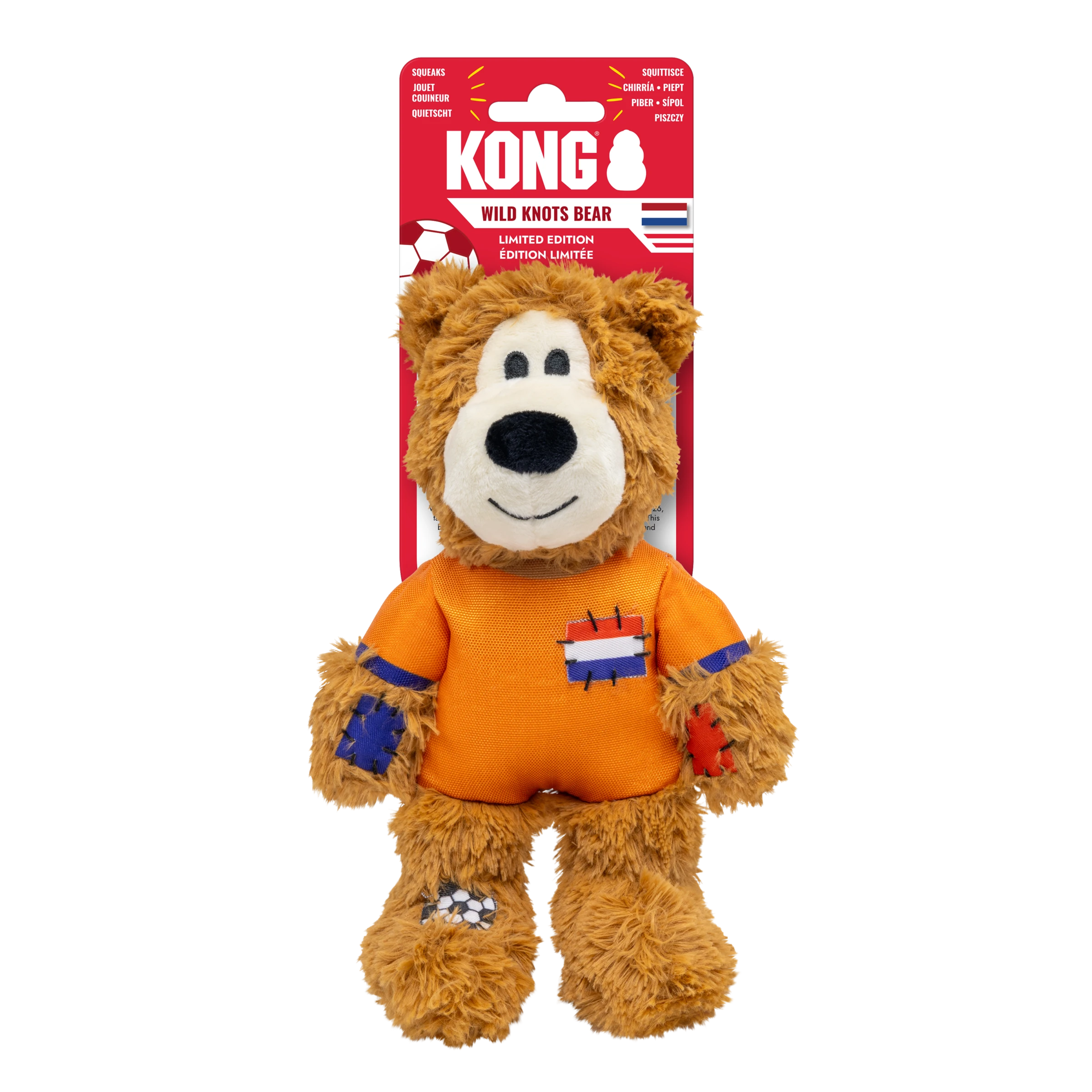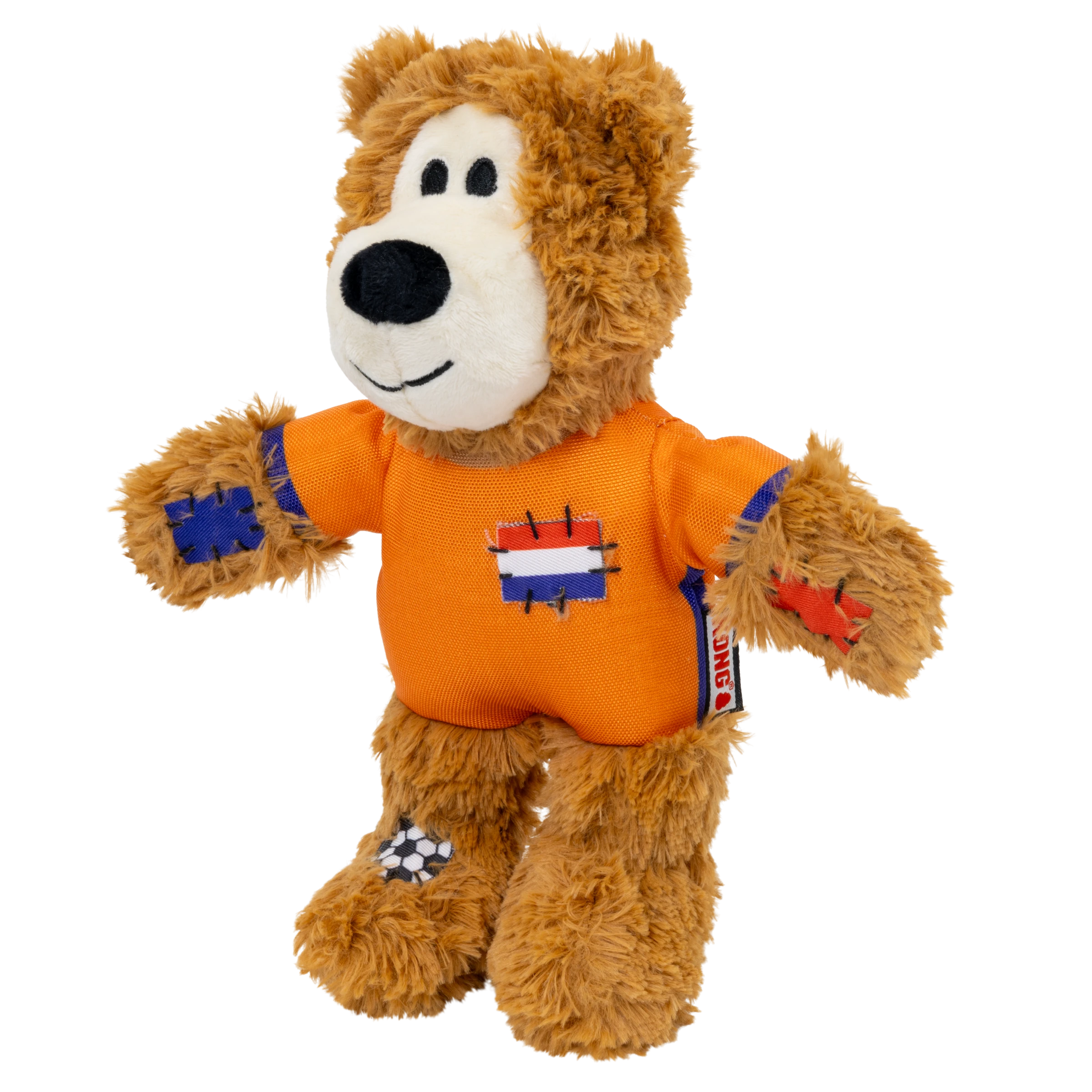 KONG Wild Knots Sport Bear is proud to represent its home country in its Limited Edition uniform. Aiming to take the dog park by storm in its playtime debut, Wild Knots Bear plays with six knots and a soft yet durable texture. Thanks to hours of training and its internal knotted rope, this toy withstands playful pulling and light chewing while catering to dogs' playful instincts to thrash, tug, and wrestle. Varied textures and a squeaker keep the fun going, but this plush pal is the perfect snuggle buddy when it's time for a post play recovery nap. Whether you're cheering for their team or allowing your dog to gnaw on the competition, Wild Knots Bear is the perfect teammate when it's time to play.