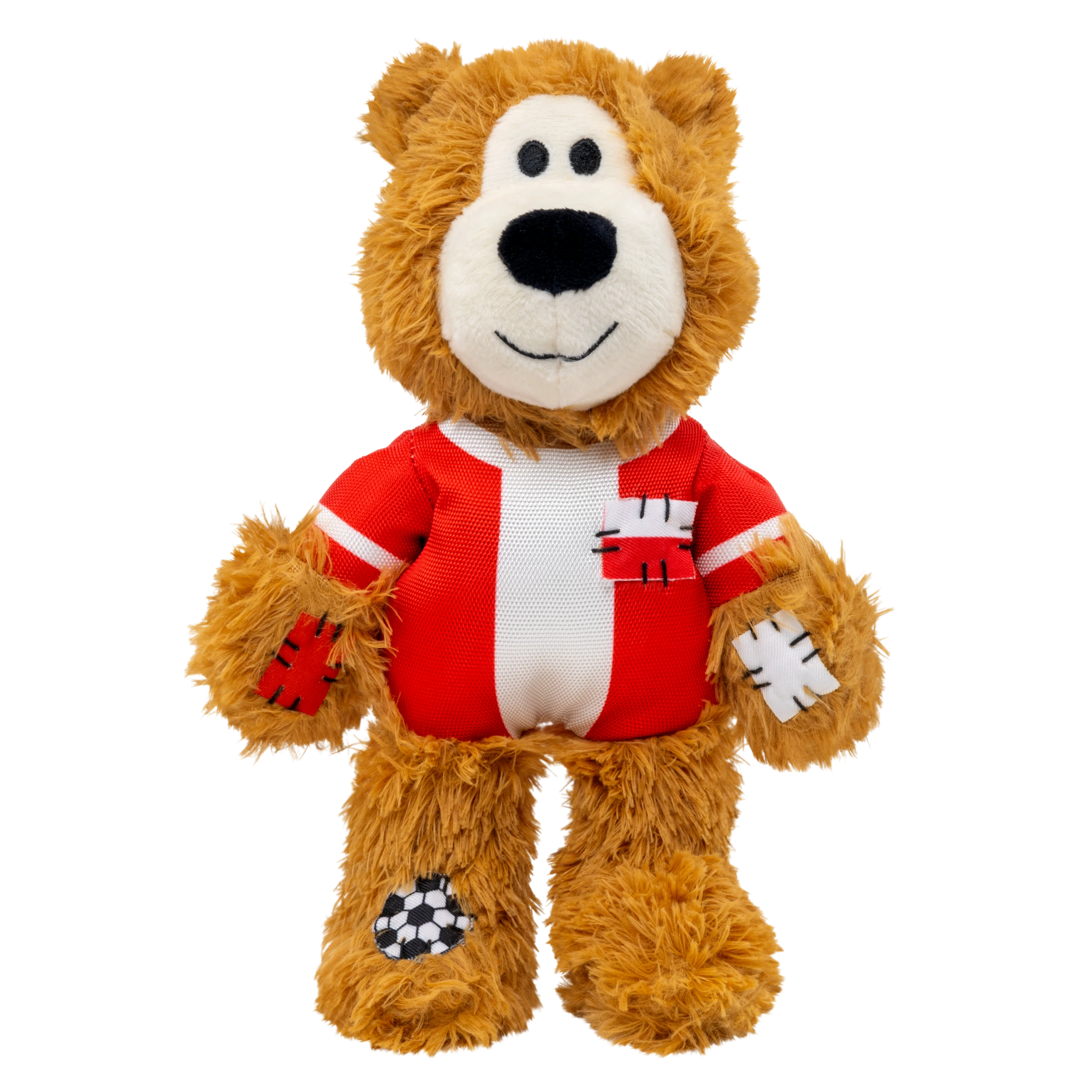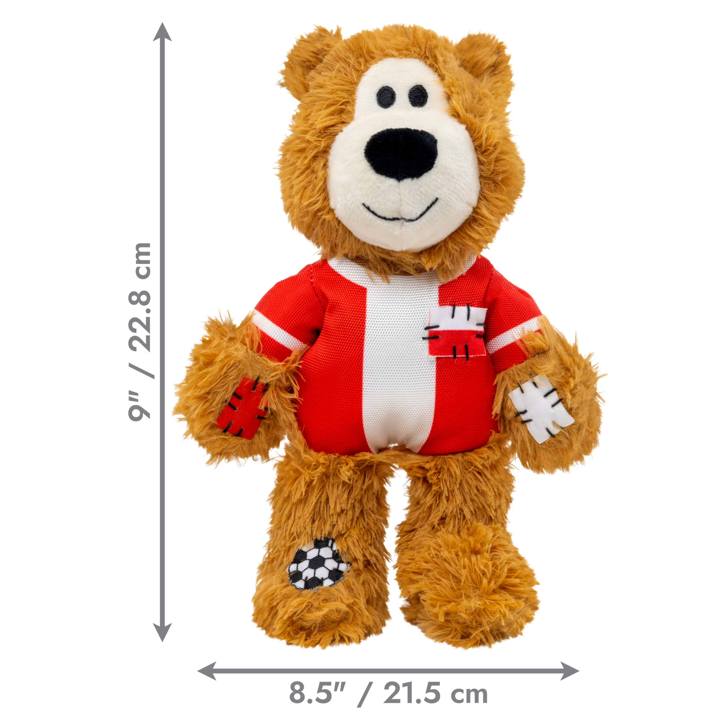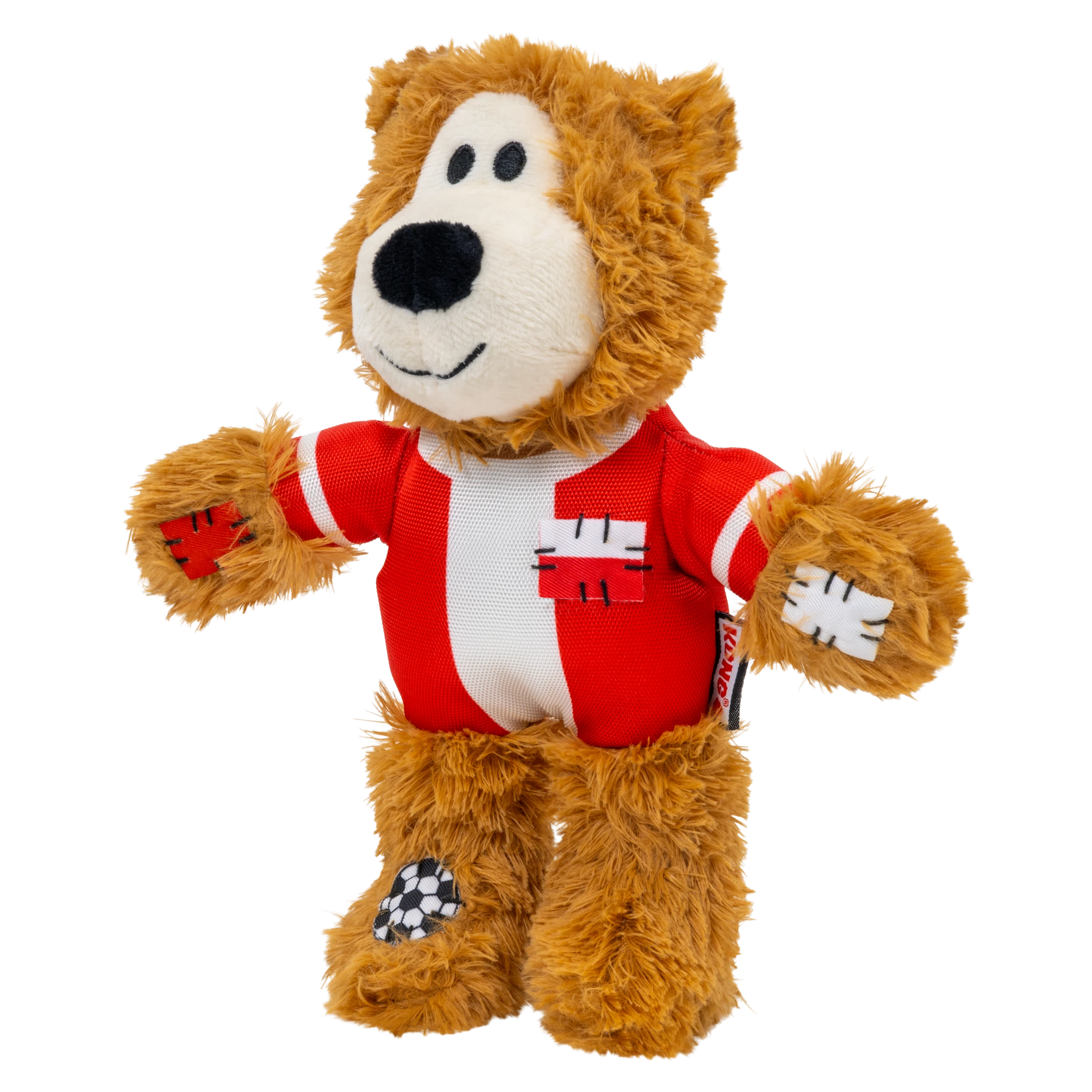 KONG Wild Knots Sport Bear is proud to represent its home country in its Limited Edition uniform. Aiming to take the dog park by storm in its playtime debut, Wild Knots Bear plays with six knots and a soft yet durable texture. Thanks to hours of training and its internal knotted rope, this toy withstands playful pulling and light chewing while catering to dogs' playful instincts to thrash, tug, and wrestle. Varied textures and a squeaker keep the fun going, but this plush pal is the perfect snuggle buddy when it's time for a post play recovery nap. Whether you're cheering for their team or allowing your dog to gnaw on the competition, Wild Knots Bear is the perfect teammate when it's time to play.