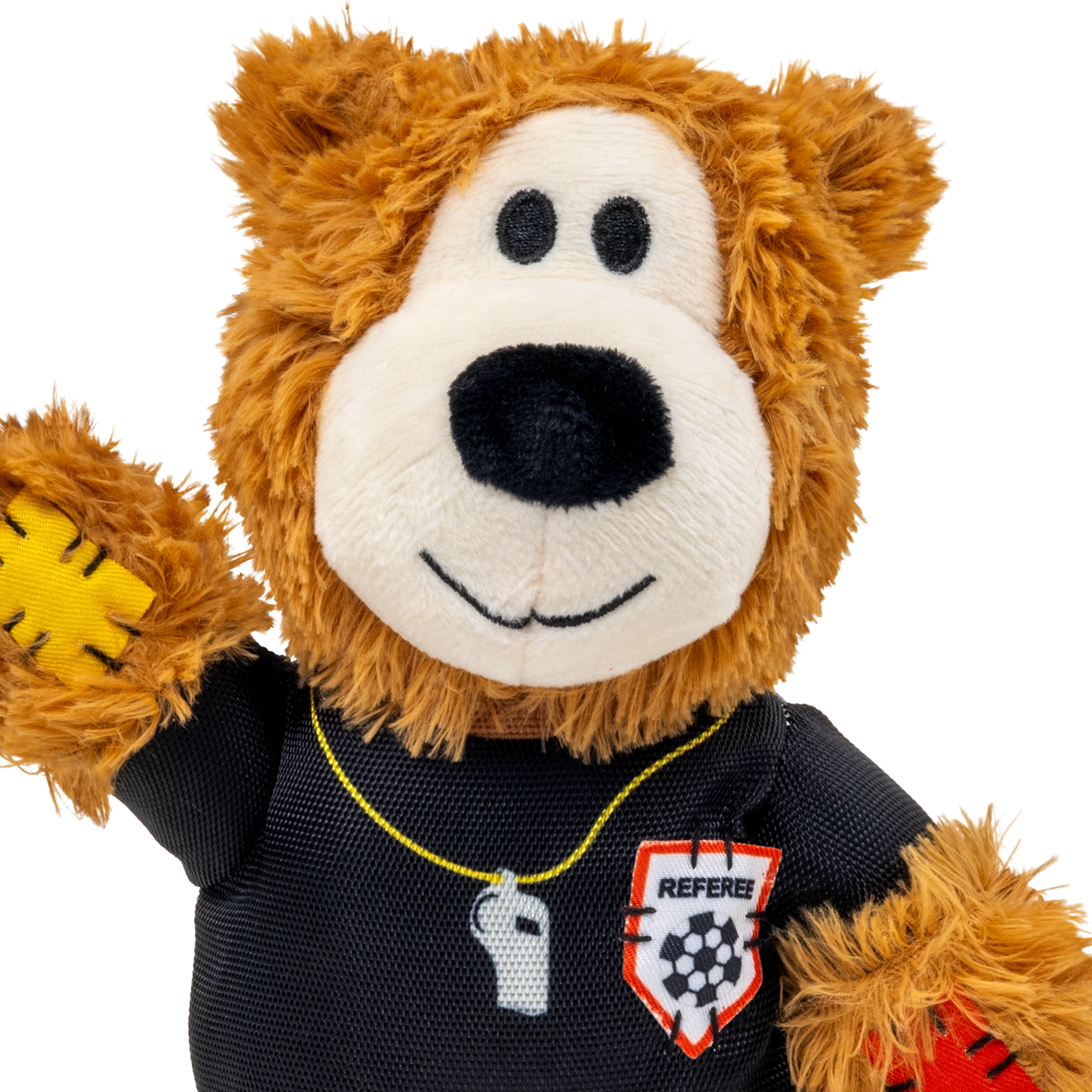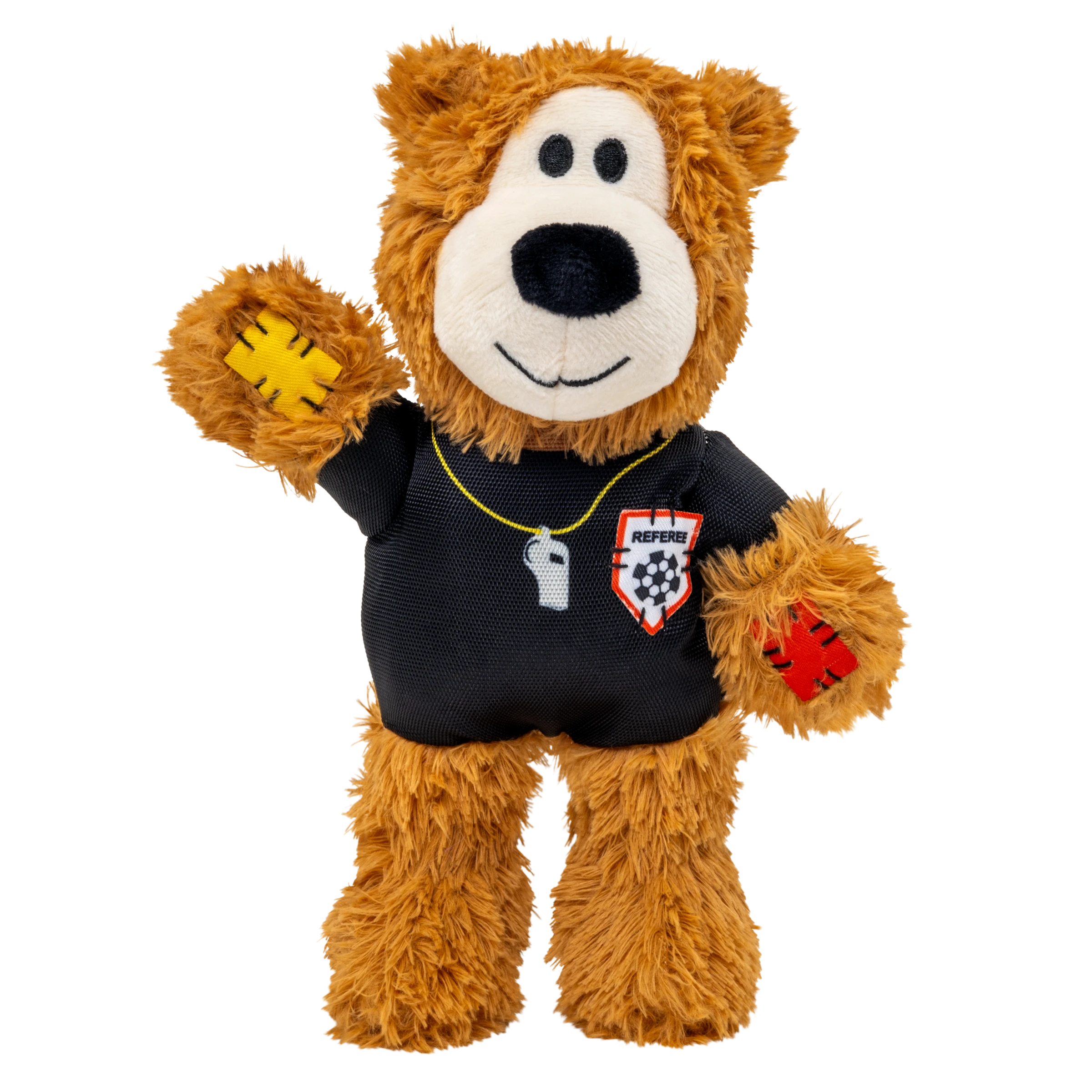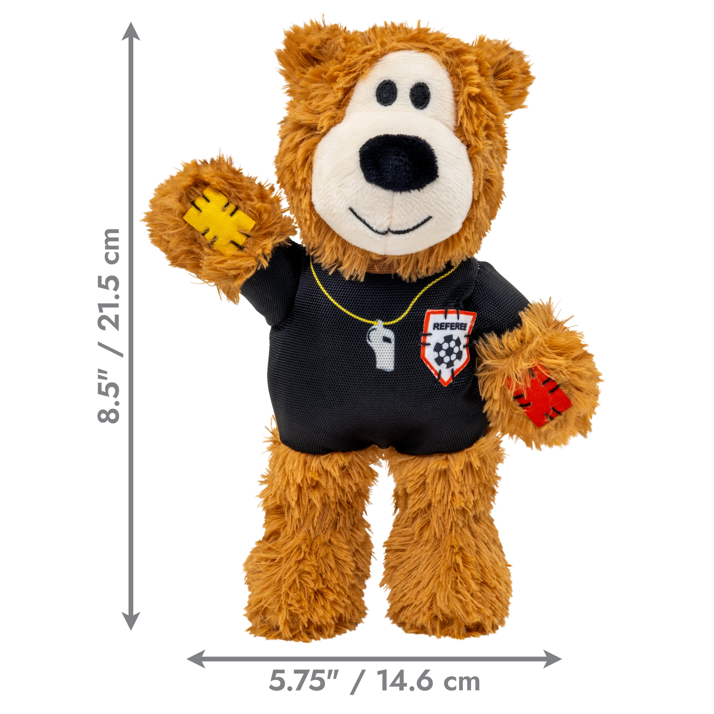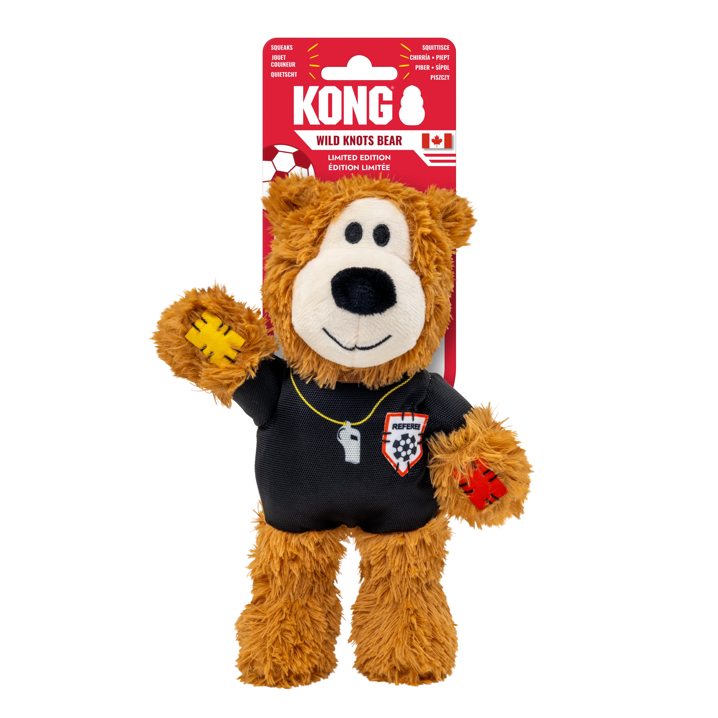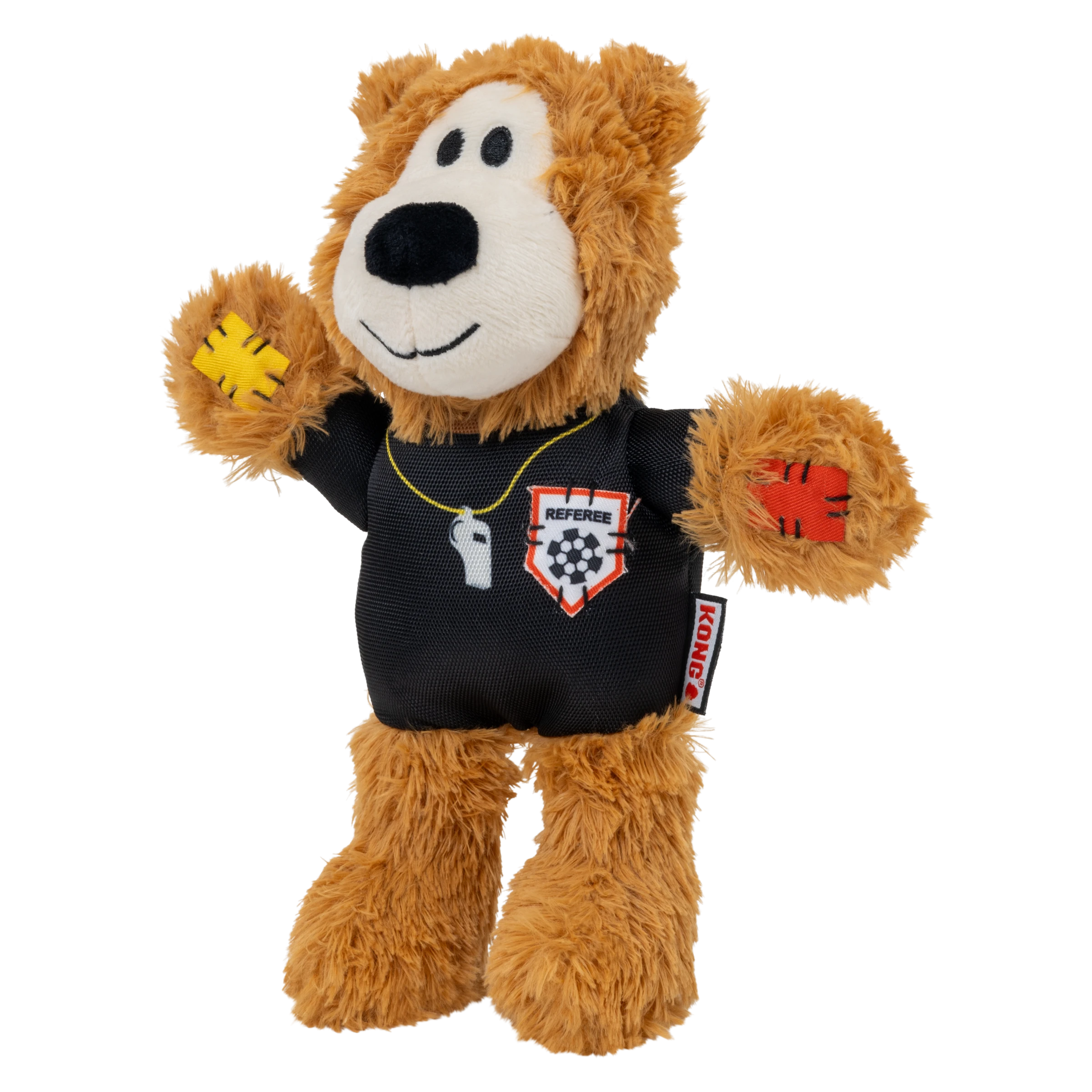 KONG Wild Knots Sport Bear is proud to keep the game in order on an international stage in its Limited Edition Referee Uniform. Aiming to take the dog park by storm in its playtime debut, Wild Knots Bear plays with six knots and a soft yet durable texture. Thanks to hours of training and its internal knotted rope, this toy withstands playful pulling and light chewing while catering to dogs' playful instincts to thrash, tug, and wrestle. Varied textures and a squeaker keep the fun going, but this plush pal is the perfect snuggle buddy when it's time for a post play recovery nap. Whether you're cheering for their team or allowing your dog to gnaw on the competition, Wild Knots Bear is the perfect teammate when it's time to play.