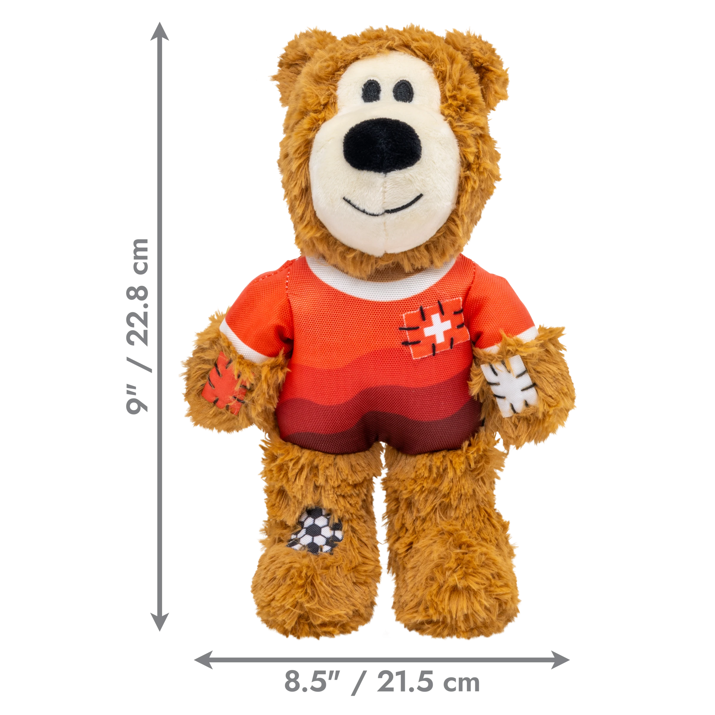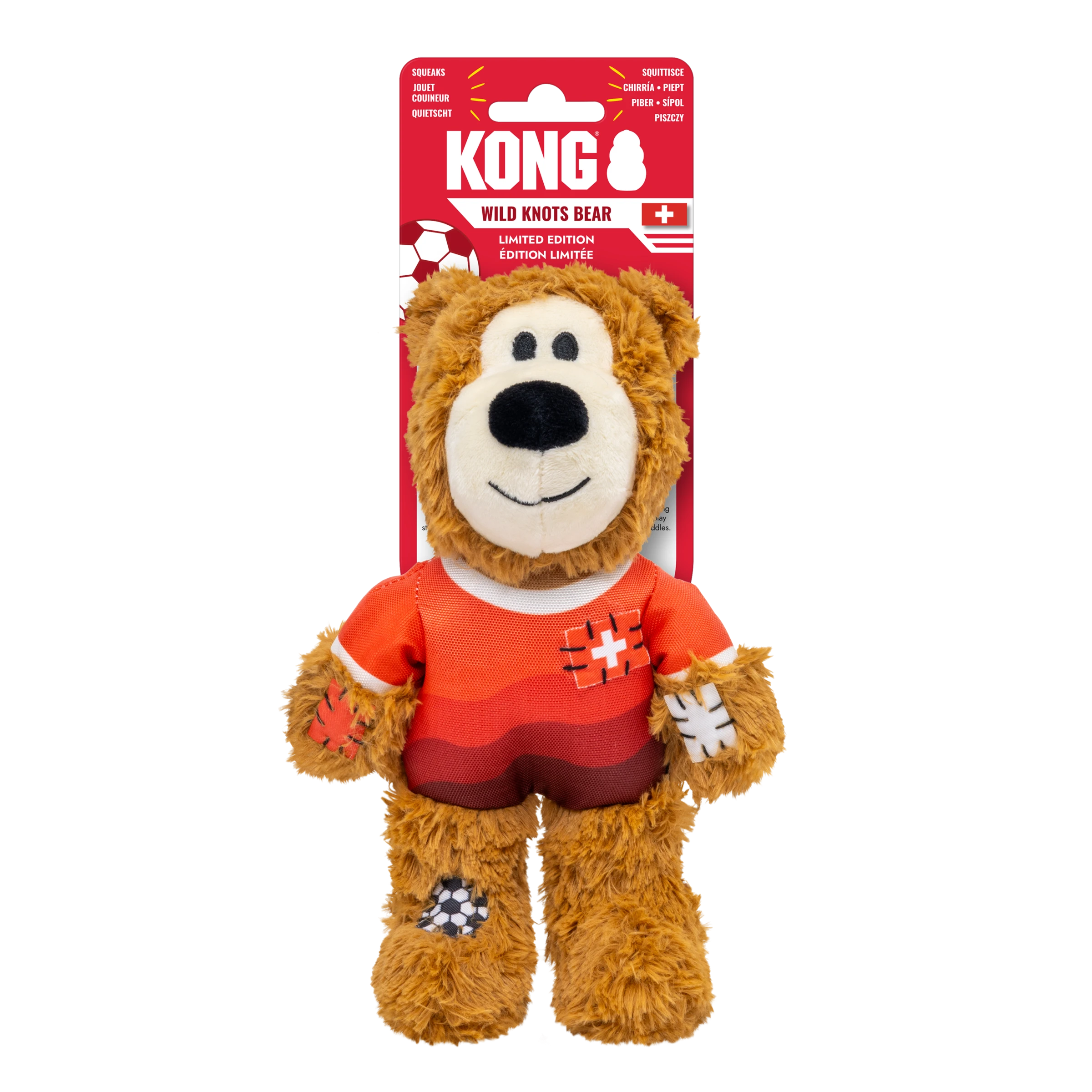 KONG Wild Knots Sport Bear is proud to represent its home country in its Limited Edition uniform. Aiming to take the dog park by storm in its playtime debut, Wild Knots Bear plays with six knots and a soft yet durable texture. Thanks to hours of training and its internal knotted rope, this toy withstands playful pulling and light chewing while catering to dogs' playful instincts to thrash, tug, and wrestle. Varied textures and a squeaker keep the fun going, but this plush pal is the perfect snuggle buddy when it's time for a post play recovery nap. Whether you're cheering for their team or allowing your dog to gnaw on the competition, Wild Knots Bear is the perfect teammate when it's time to play.