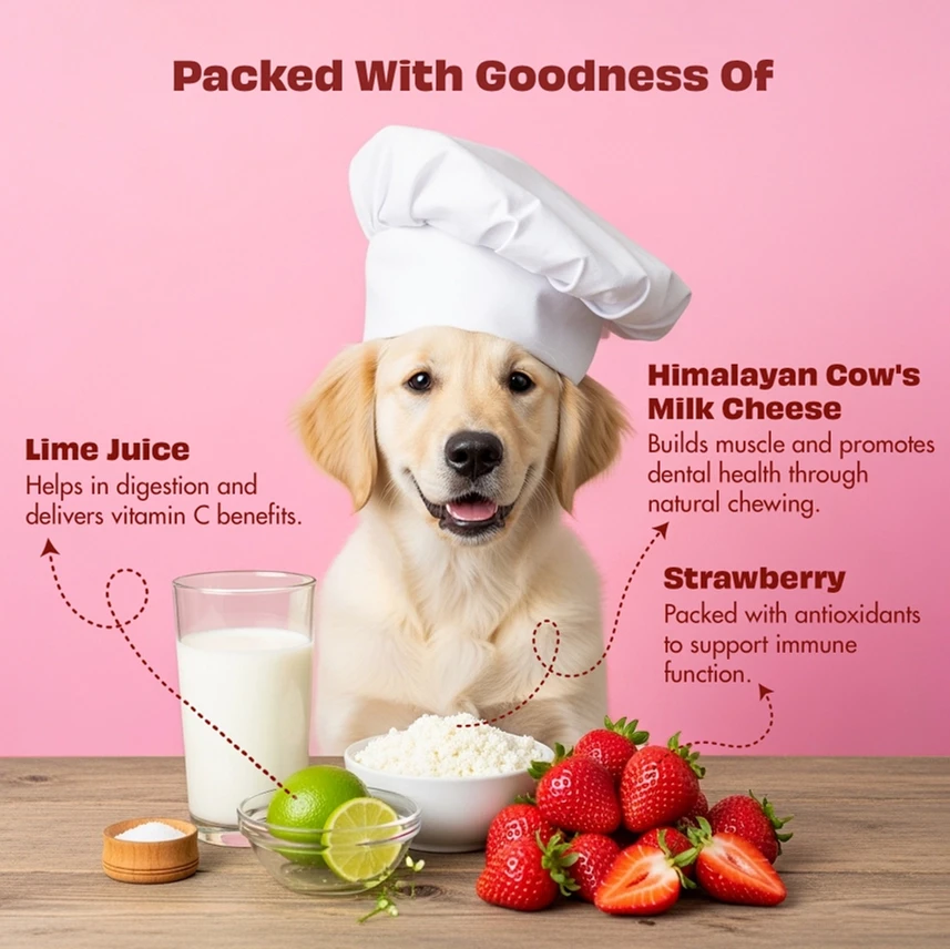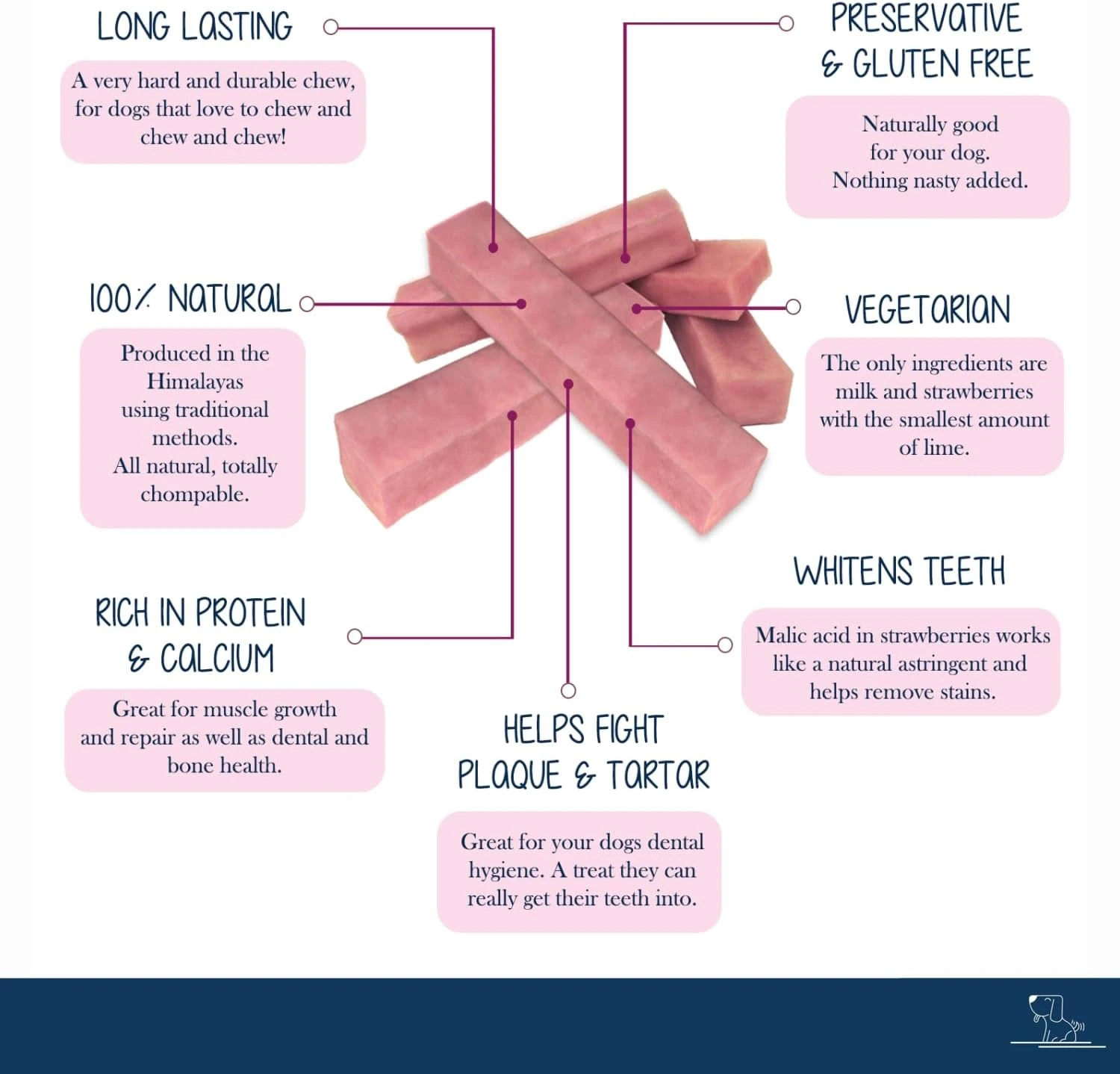 Millie’s Munchies Himalayan Cheese Chew in Strawberry, the 100% Natural, Grain Free, Long Lasting Dental Chew for Dogs with the Added Benefits of Strawberry! Strawberry is both tasty and packed with nutrients, rich in vitamin C, to support your dog’s immune system, while the high fibre content aids digestion. The omega 3 fatty acids help contribute to a shiny coat and skin. The hard consistency of these chews ensures that dogs have to put in some effort to soften and break them apart, resulting in a longer chewing experience and helping reduce plaque and tartar. Each chew is also rich in calcium and protein thanks to the natural properties of milk. These hard chews can trace their roots back to the picturesque hills of the Himalayas, where they were originally crafted for human consumption as yak chews.