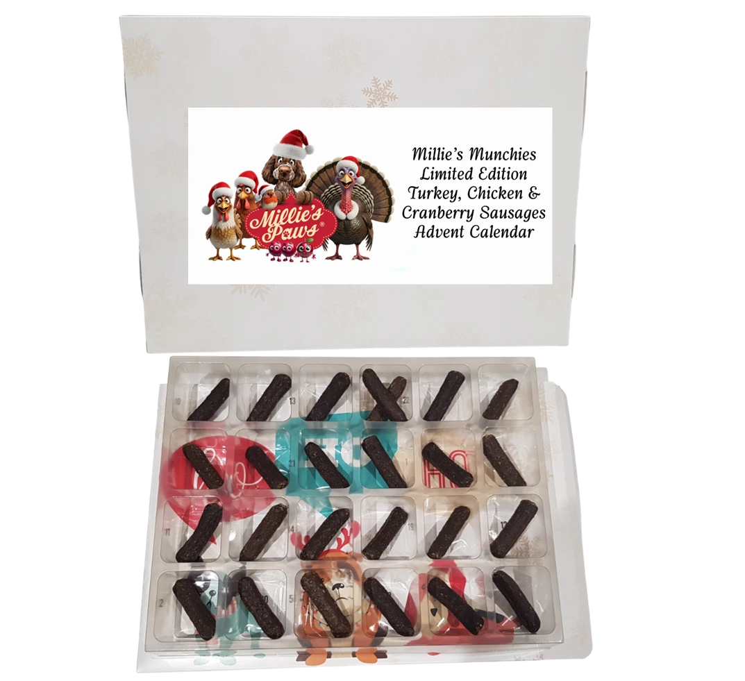 Millie’s Munchies Limited Edition Turkey, Chicken and Cranberry Sausages Advent Calendar is great festive treat in the run up to Christmas day. This calendar contains Turkey, Chicken with a little festive Cranberry. Your furbaby is sure to love opening their calendar each day before Santa Paws arrives!
