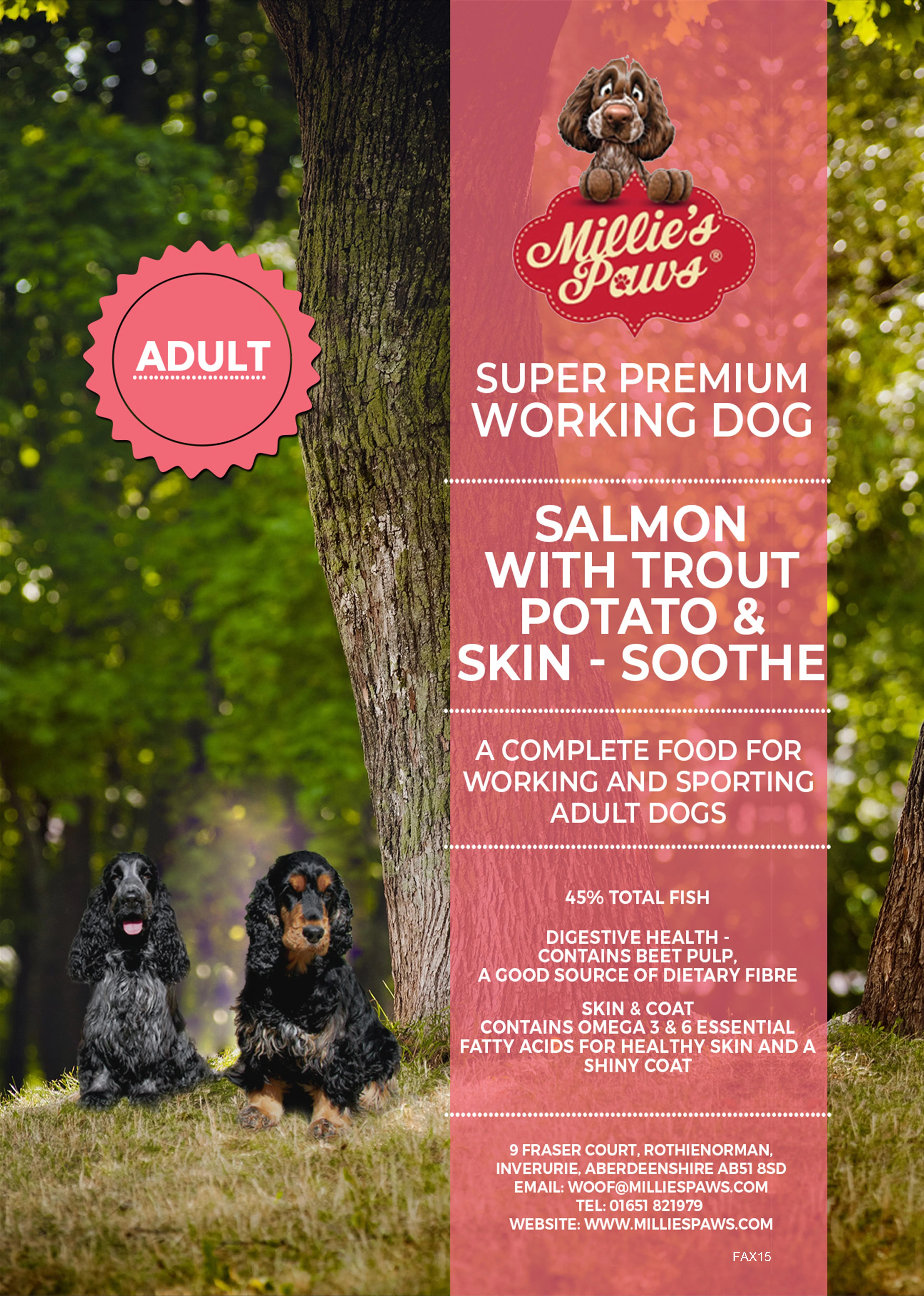 Millie's Paws Super Premium Salmon with Trout, Potato and Skin Soothe Working Dog Food 15kg contains blend of 10 specially selected herbs which have a range of properties that help alleviate signs of itching and scratching. Our food contains 45% total fish which is responsibly sourced and is a highly digestible protein source. Salmon is naturally rich in omega 3 essential fatty acids which have anti-inflammatory properties, provide support for skin and coat condition and joint health.