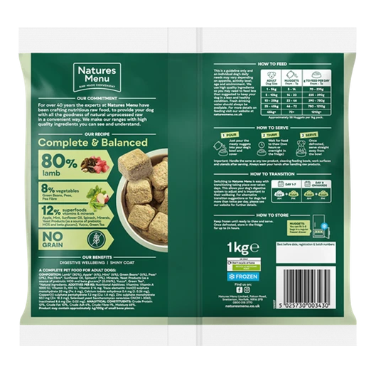 Natures Menu Complete and Balanced 80/20 Lamb Nuggets 1kg are a complete and balanced single protein raw meal for dogs. Made with 80% lamb blended with 20% nutritious superfoods. Chicken free. No grain. Looking for lamb dog food? Look no further than these raw lamb dog food in easy serve nuggets. These nuggets contain 80% lamb are blended with peas, green beans and mint. Natures Menu Complete and Balanced 80/20 raw dog food, is crafted and approved by in house experts and made to FEDIAF guidelines, so you can feed your dog safe in the knowledge that you are giving them the highest quality natural, ingredients in every meal. Their raw lamb nuggets are a single source protein for dogs, made from natural ingredients you can see and understand. This is lamb dog food with a difference; taking the guesswork out of raw feeding!