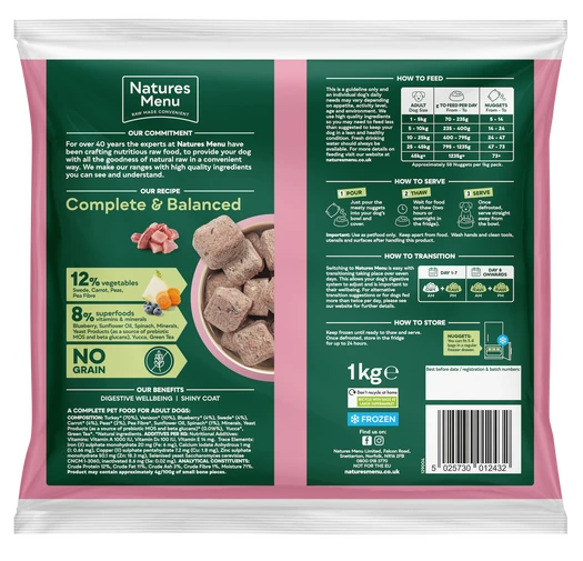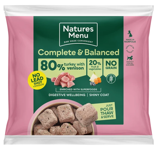 Natures Menu Complete and Balanced 80/20 Turkey and Venison Nuggets 1kg are full flavoured venison and turkey nuggets with juicy fruits and vegetables make this a tasty complete and balanced meal that’s packed with wholesome goodness. No grain. Chicken Free. Approximately 58 nuggets per pack. These raw venison and turkey dog food nuggets are a great way to introduce a novel protein, with the full, appetising flavour of venison. As with all their complete and balanced meals, you can feed this raw venison and turkey dog food with the peace of mind that comes with choosing a food that's crafted by experts and made to FEDIAF guidelines. Natures Menu 80/20 dog food venison and turkey nuggets are complete and balanced and made with the highest quality, natural ingredients you can see and understand.