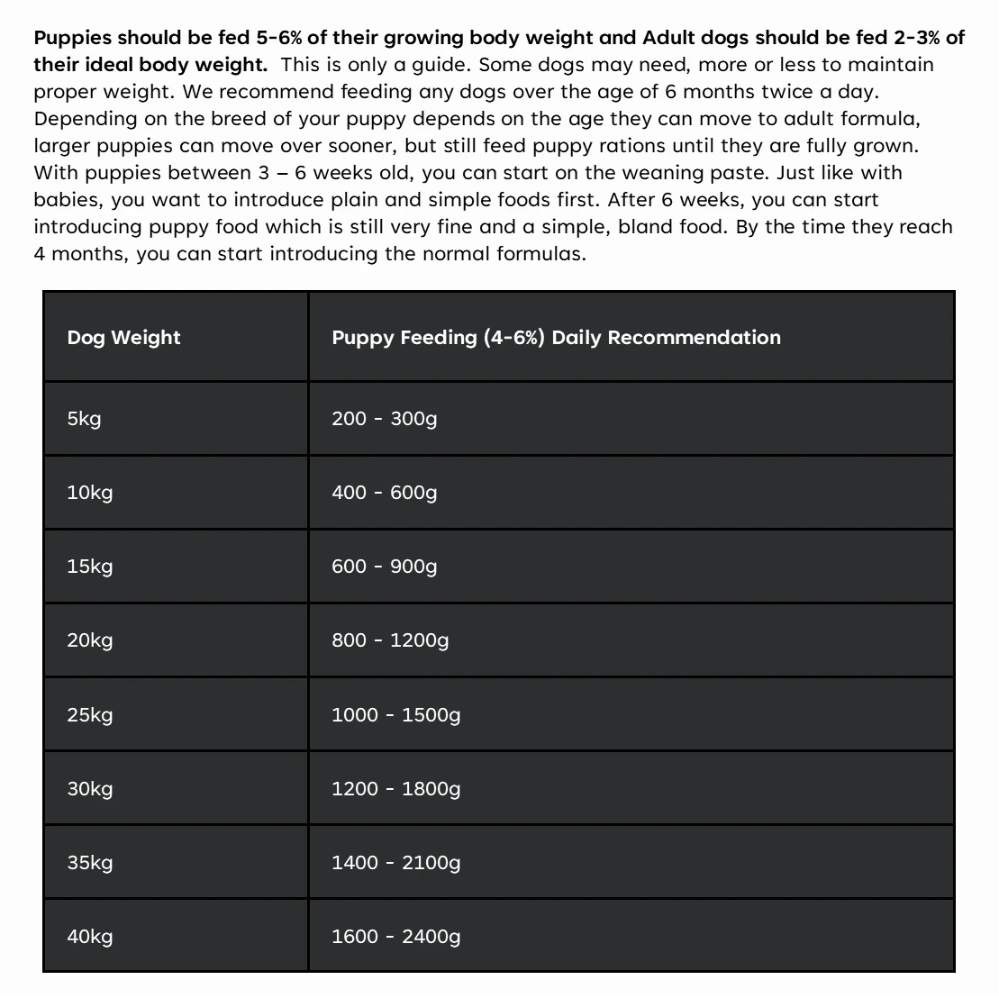 This is only a guide. Some dogs may need, more or less to maintain proper weight. We recommend feeding any dogs over the age of 6 months twice a day. Depending on the breed of your puppy depends on the age they can move to adult formula, larger puppies can move over sooner but still feed puppy rations until they are fully grown.