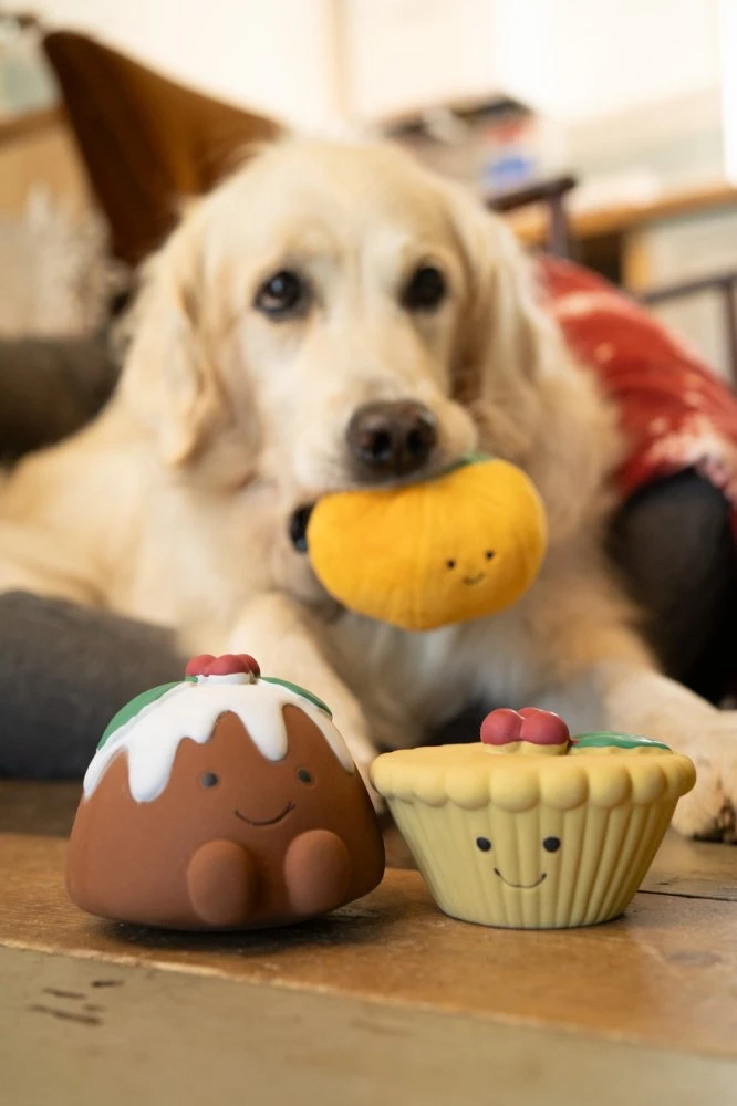 Saski Satsuma Plush Christmas Dog Toy. Cute, soft, strong and durable, the perfect playmate for your pet! Tough squeaker for long lasting festive fun. Interactive toy is perfect for playful dogs. The perfect present for your pet this Christmas
